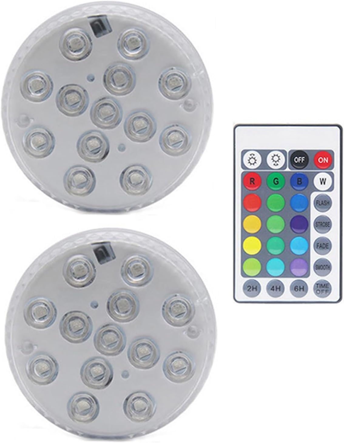 Pool Lights13leds Submersible Light IP68 Waterproof RGB Underwater Lights Aquarium Lamp for Fountain Pond Pool Vase Fish Tank Wedding DecorSpecifications:Wattage: 2.4W per pieceLight color: RGB 16ColorsPower source: 3 * AAA batteries per piece (not provided)LED quantity: 13LED beads per pieceIngress protection: IP68Item weight:90g/pcsSize:70*30mmSpecial Feature:Reusable:Operated by 3 x AAA batteries, Easy to replace,save money for youMulti Color:super bright 13led built in,4 dynamic color changing modes, 16 different colors in static modes.Waterproof:The LED lights are made of double waterproof materials,Don't worries about that when submerged.Remote control: wireless design,IR remote control, dimming and time functionand ON/OFF.Multi-Purpose:Great for flower vases,pool,fish tank,wedding, party or other occasionsNotice:* Make sure that screw up the cap clockwise properly and tightly before throw it into water.* When the battery runs out,the lights stay stuck in red,if no longer switching between colors and remote stop work,then please replace the battery.* The max. depth to is recommend to be less than 2m.