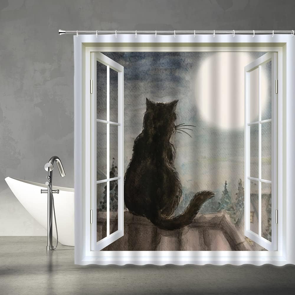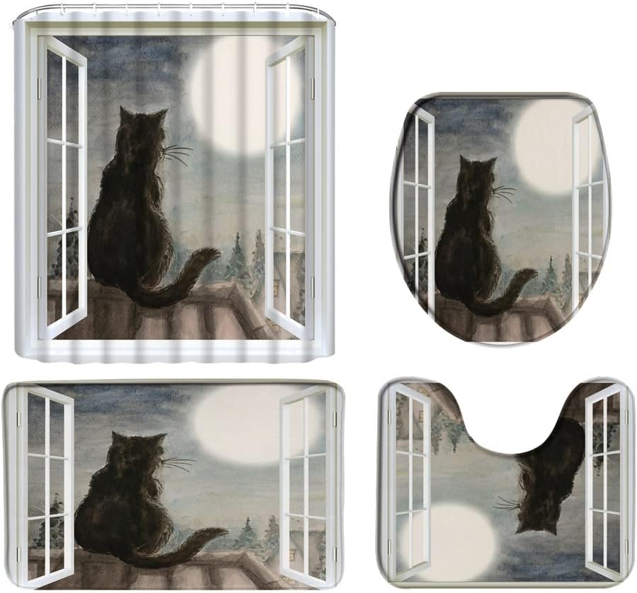 4pcs Black Cat Shower Curtain Set with Rug Moon Night Animal Kitty Staring at The Moon Abstract Watercolor Art Oil Painting Bathroom Set with Hooks(Bath Mat,U Shape and Toilet Lid Cover Mat)