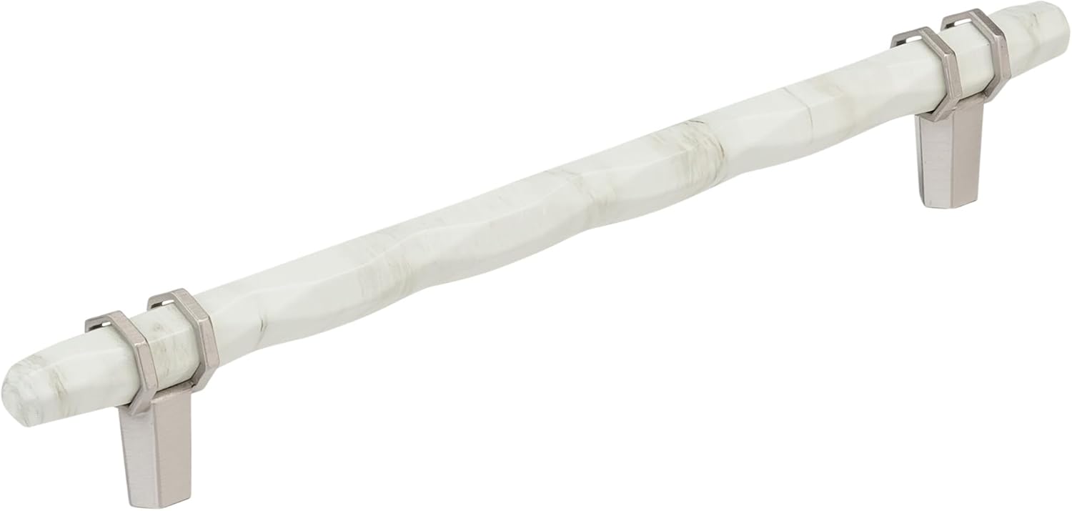 The Amerock BP36664MWBBZ Carrione 10-1/16 inch (256mm) Center-to-Center Pull is finished in Marble White/Golden Champagne. Crafted by hand and balancing timeless beauty with clean contemporary style, this Carrara marble-inspired look takes new form in the Carrione collection. A stunning split finish, Amerock's marble white/golden champagne finish marries the luxe look of classic grey veined white marble with soft warm accents of golden champagne. Founded in 1928, Amerock’s award-winning home solutions including decorative and functional cabinet hardware, bath accessories, decorative hooks and wall plates have built the company’s reputation for chic design accessories that inspire homeowners to express their personal style. Amerock offers a variety of styles and finishes at affordable prices that add the perfect finishing touch to any room.
