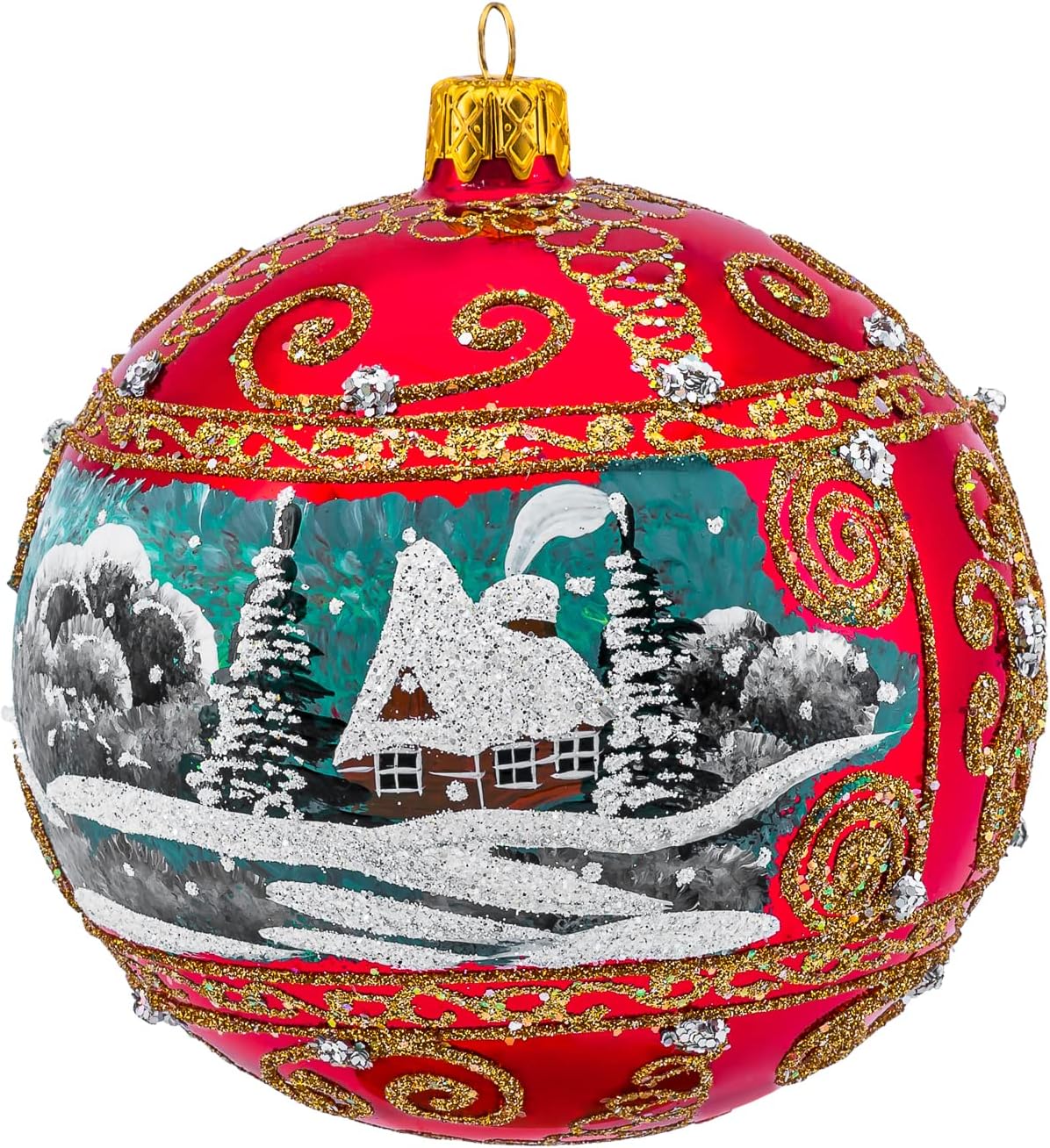 This beautifully handcrafted blown glass Christmas tree ornament brings winter charms to life . A lovely presentation of winter countryside view with silver poinsettia drawing on the sides, featuring glitter details and silver colored bead embellishments. This festive and elegant holiday decoration is hand-blown and hand crafted by artisans in Poland. With unparalleled artistry and exceptional detail, Polish Gallery Christmas ornaments are perfect for preserving precious memories, commemorating special milestones and celebrating individual hobbies and interests. Polish Gallery traditional Christmas ornaments make great Christmas gifts for everyone on your list. They bring childhood memories to live and are fun to collect.When it’s time to decorate the tree, yours will shine with stunning Christmas ornaments from the Polish Gallery. Each ornament is uniquely designed. Decorated with shimmering glitter and beaded detailing. It will add lots of subtle sparkle and spectacular look to your Christmas tree. Our collection of Christmas ornaments is a majestic work of art that will be treasured for generations over holidays.