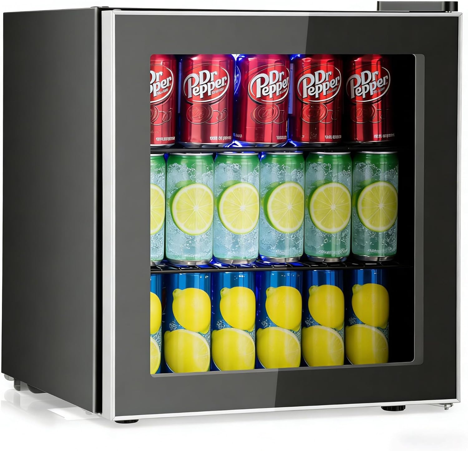 Description:Enjoy perfectly chilled drinks with our beverage refrigerator cooler!The compact beverage cooler features a reversible door made of double-layer tempered glass that offers clear visibility while providing excellent thermal insulation. With a total capacity of 1.3 cubic feet, the interior is customizable thanks to a removable shelf that accommodates various beverage heights, fitting up to 55 cans or 12 bottles comfortably. Reliability and quiet operation are hallmarks of this countertop small fridge, which uses an integrated compressor for powerful cooling without disturbing the surrounding environment. ETL-certified for safety and performance, the wine cooler refrigerator offers 7 precise temperature settings from 29.1°F to 45.9°F, complemented by an interior blue LED light for a stylish touch.Features:Built-in compressor for powerful and uniform coolingMore convenient to use thanks to a defrosting functionAdjust 7 temperature settings via the knob, from 45.9-29.1°FRemovable stainless steel shelf for customizable inner spaceThe interior blue LED light can be turned on/off with a buttonReversible door with 2-layer tempered glass for better heat insulationThe foam layer provides effective insulation to maintain temperatureSafe and silent operation thanks to low noise and ETL certificationAdjustable foot pads for enhanced balanceNo assembly requiredSpecifications:Color: BlackMaterial: Metal, Tempered GlassProduct Dimensions: 17" × 16" × 18"/43 × 41 × 45 cm (L × W × H)Net Weight: 33 lbs/15 kgInterior Size: 1.3 Cu.Ft.Capacity: 55 Cans/12 BottlesVoltage: 115V 60HzRated Current: 1.0APackage Includes:1 × Beverage Refrigerator1 × InstructionWhy You Choose Our Beverage Refrigerator Cooler?√ Adjustable temperature settings cater to different needs√ Perfect for home use thanks to its efficient yet silent cooling