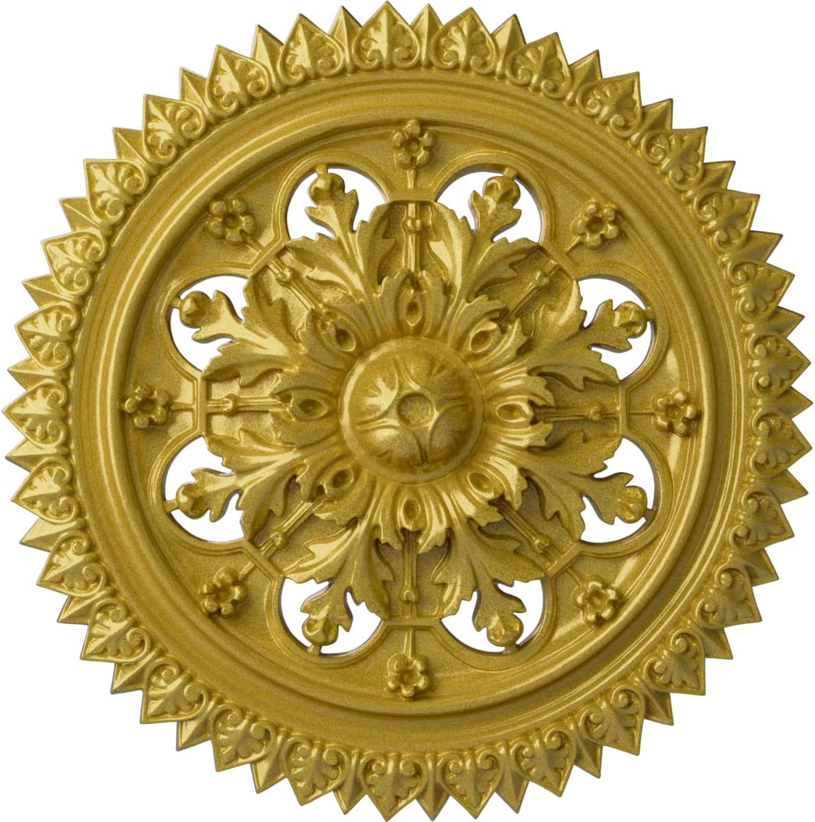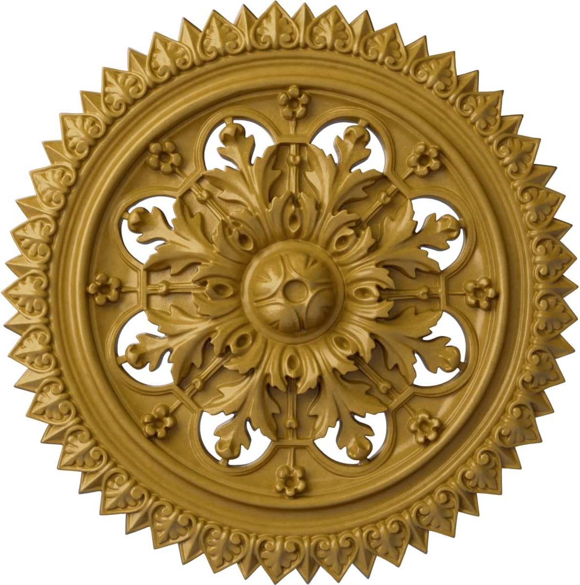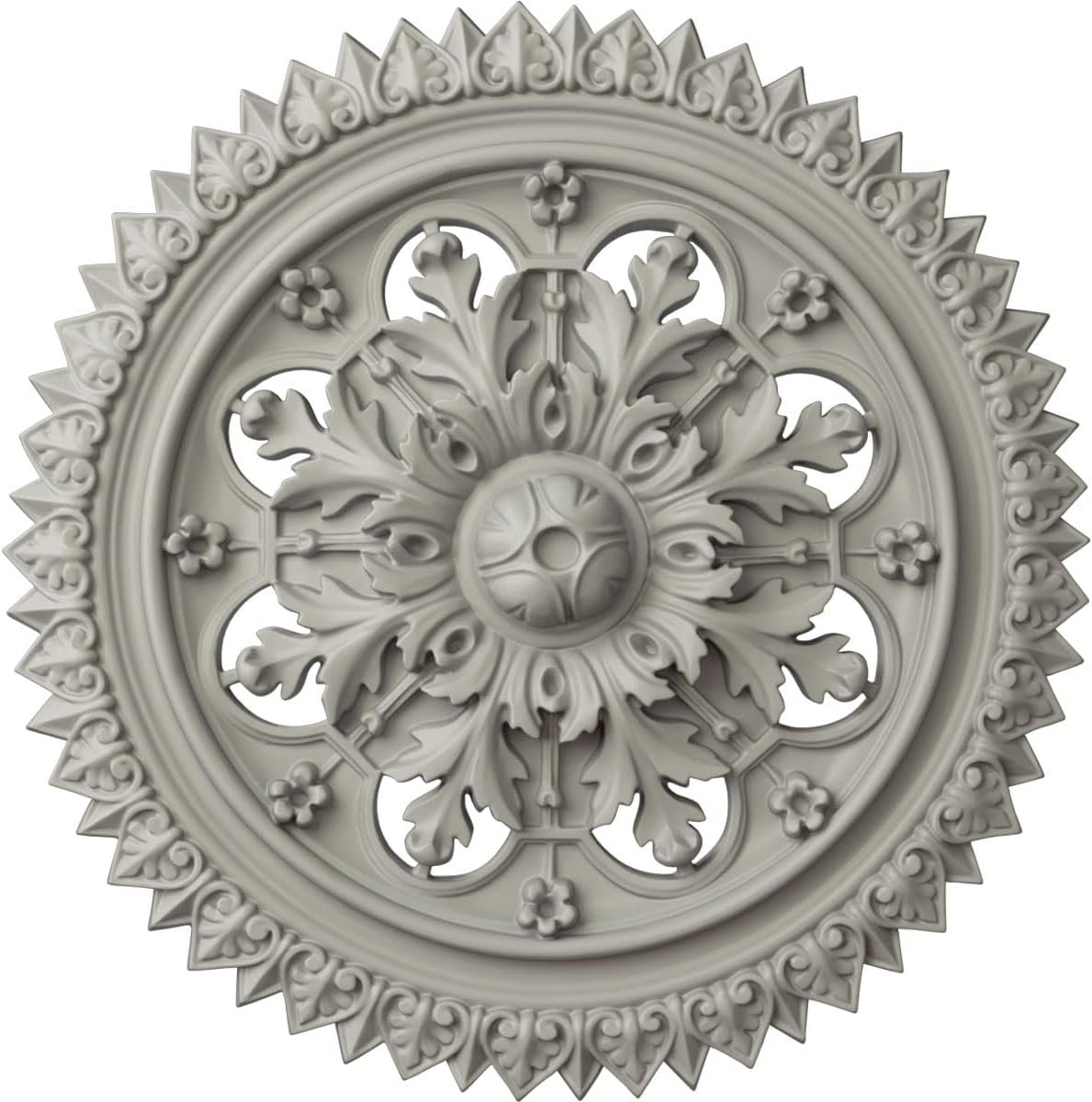 Our ceiling medallion collections are modeled after original historical patterns and designs. Our artisans then hand carve an original piece. Being hand carved each piece is richly detailed with deep relief, sharp lines, and a truly unique touch. That master piece is then used to create a mould master. Once the mould master is created we use our high density urethane foam to form each medallion. The finished look is a beautifully detailed, light weight, solid construction, focal piece. The resemblance to original plaster medallions is achieved only by using our high density urethane and not vacuum formed, "plastic" type medallions. - Medallions can be cut using standard woodworking tools to add a hole for electrical or a ceiling fan canopy. - Medallions are light weight for easy installation. - They are fully primed and ready for your paint. If you have any questions feel free to ask. These are in stock and available for immediate shipment.