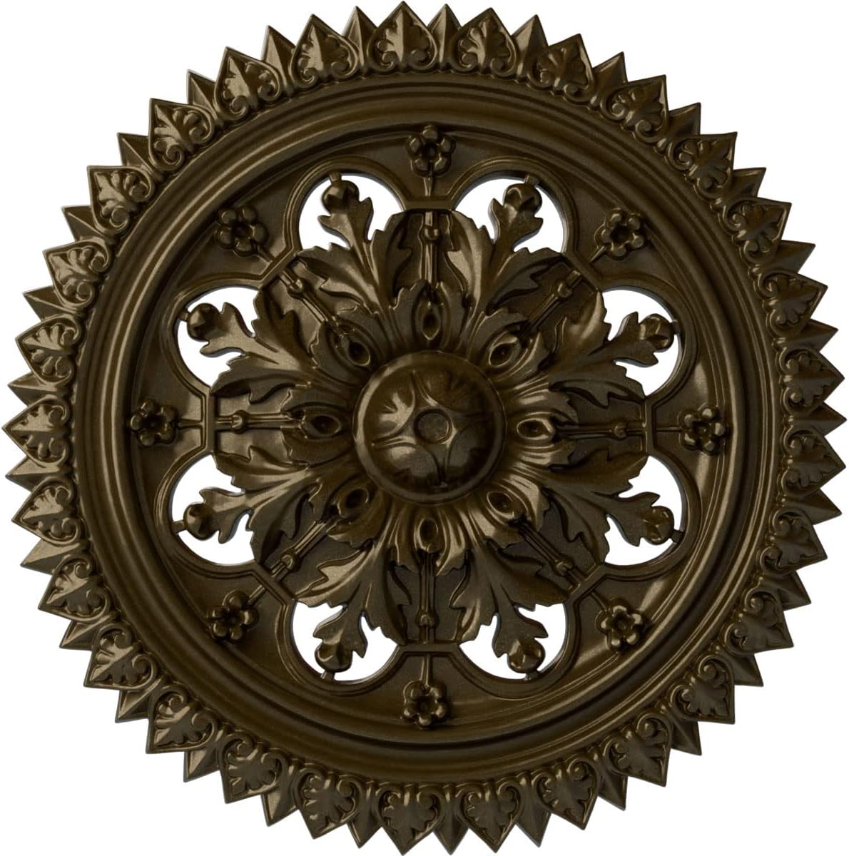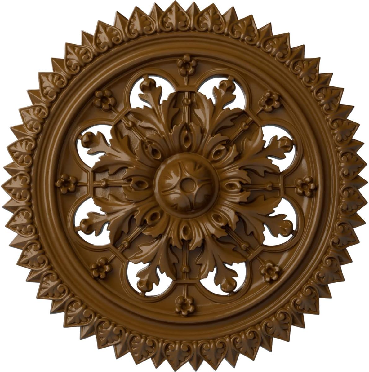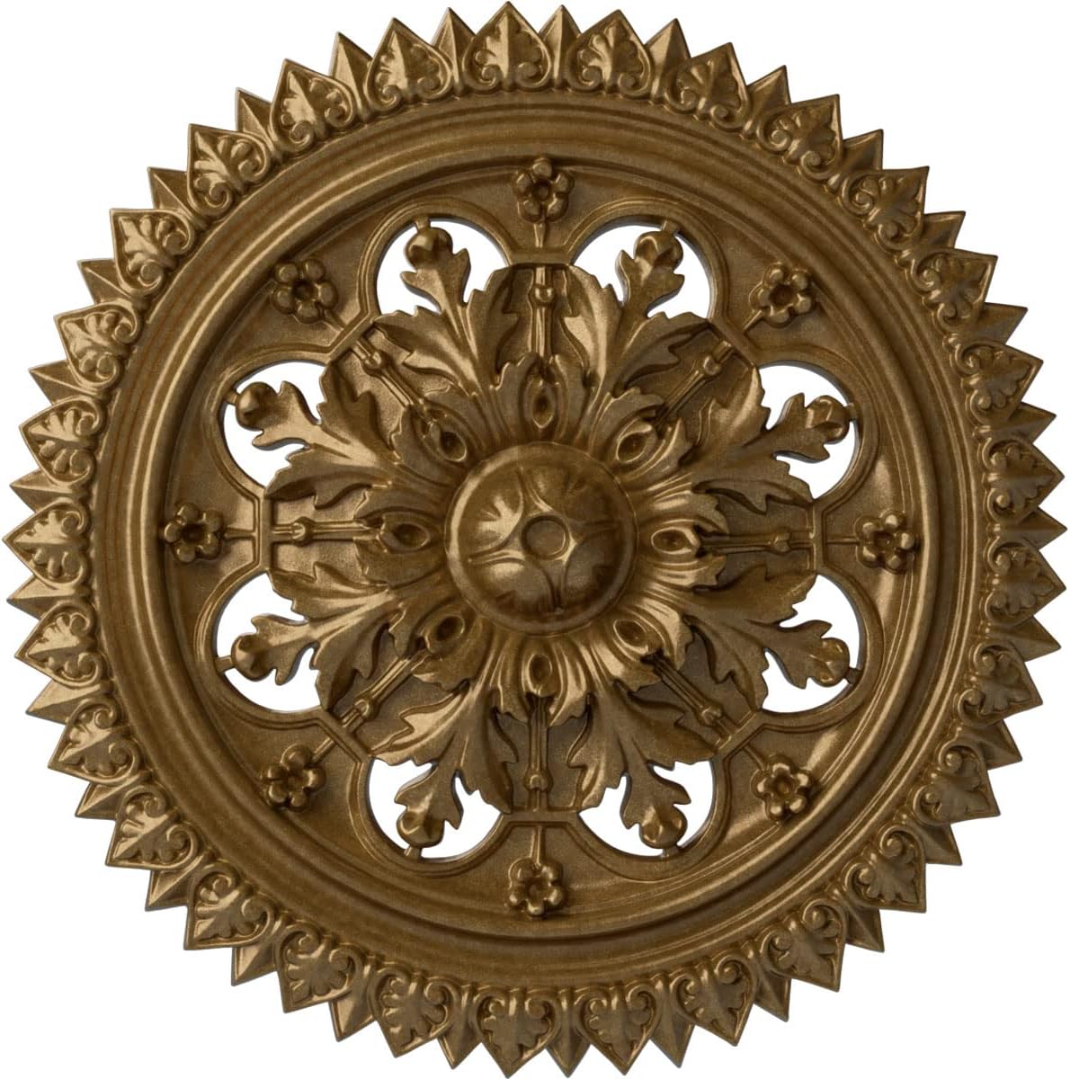 Our ceiling medallion collections are modeled after original historical patterns and designs. Our artisans then hand carve an original piece. Being hand carved each piece is richly detailed with deep relief, sharp lines, and a truly unique touch. That master piece is then used to create a mould master. Once the mould master is created we use our high density urethane foam to form each medallion. The finished look is a beautifully detailed, light weight, solid construction, focal piece. The resemblance to original plaster medallions is achieved only by using our high density urethane and not vacuum formed, "plastic" type medallions. - Medallions can be cut using standard woodworking tools to add a hole for electrical or a ceiling fan canopy. - Medallions are light weight for easy installation. - They are fully primed and ready for your paint. If you have any questions feel free to ask. These are in stock and available for immediate shipment.