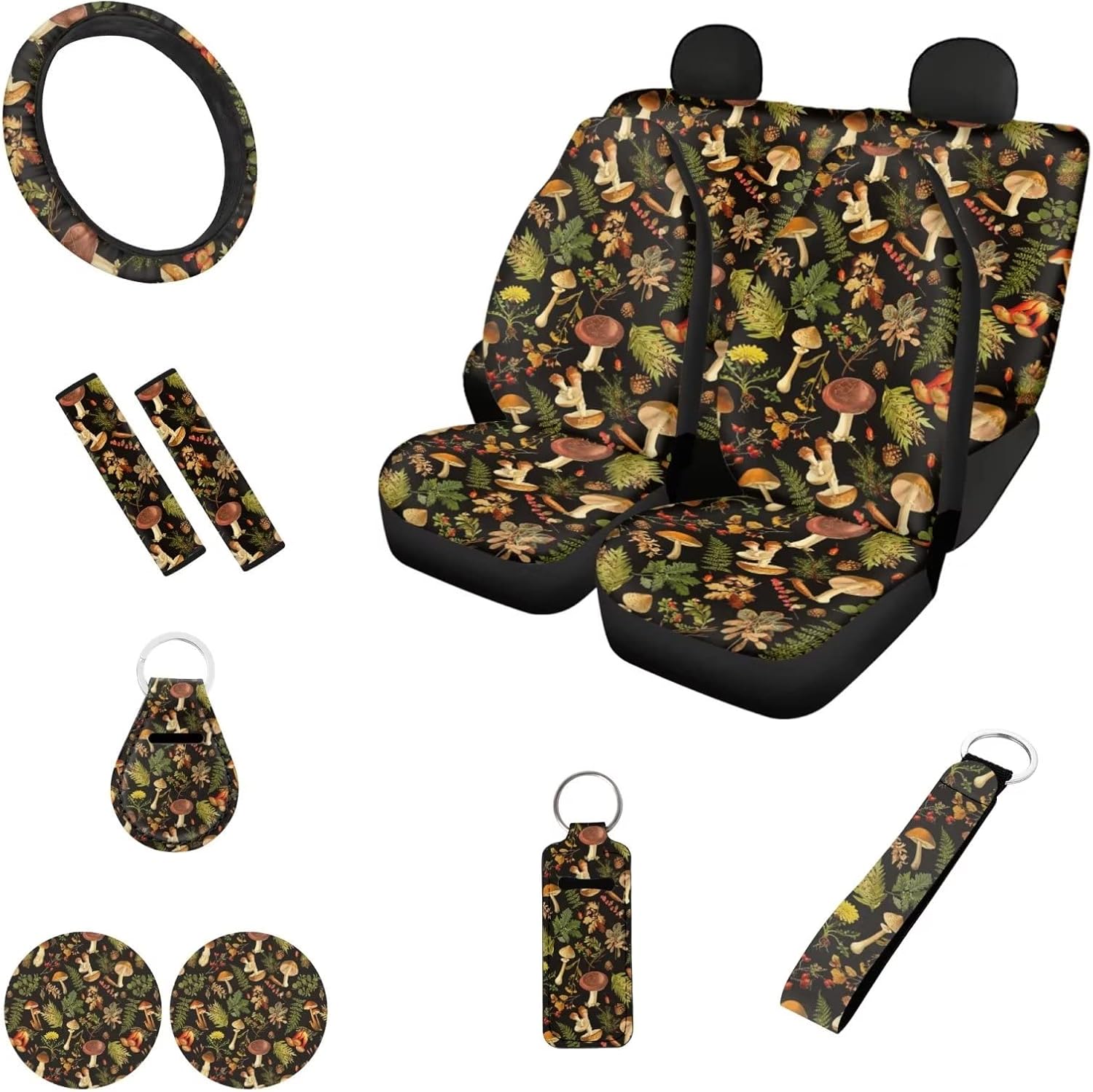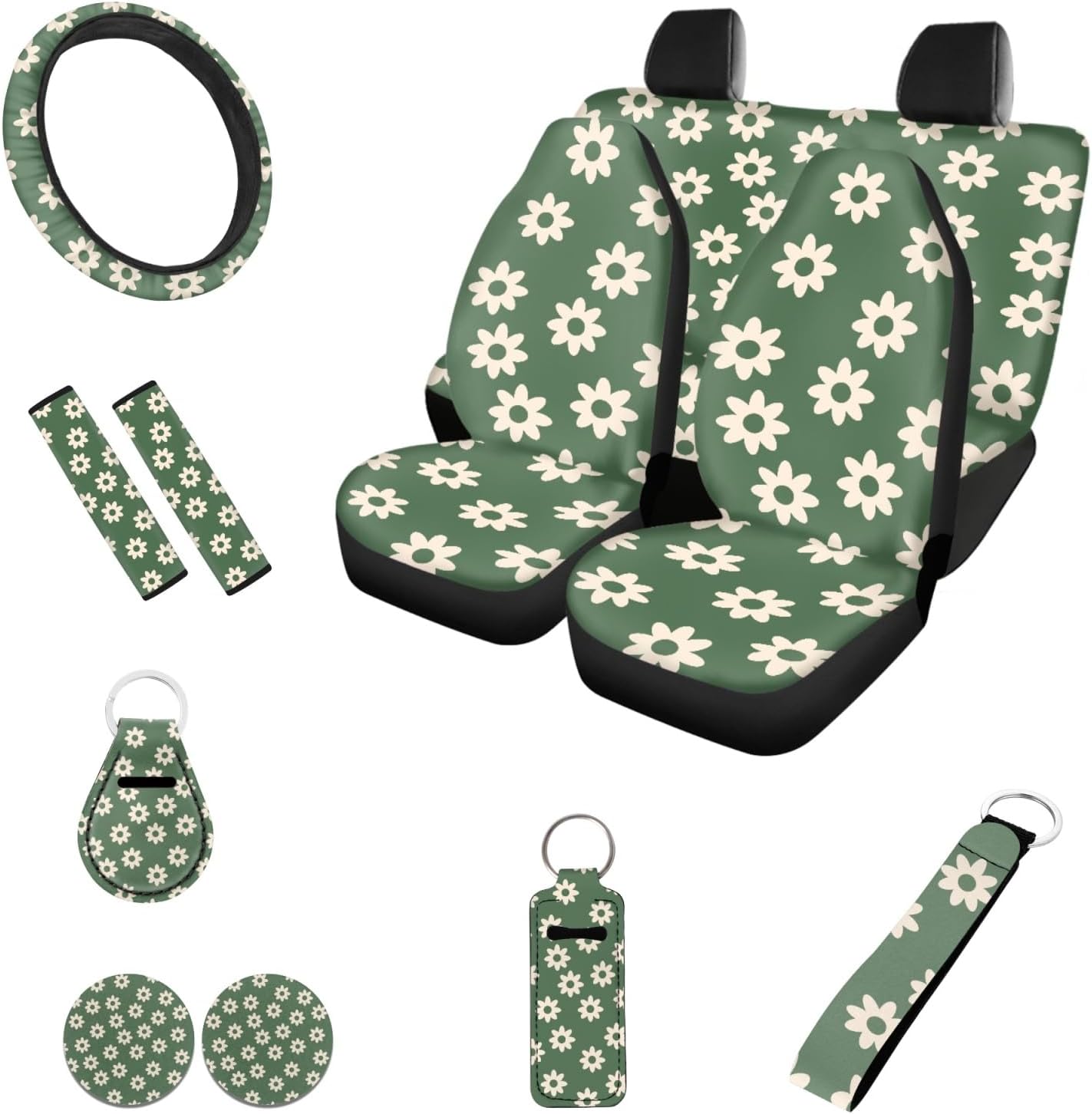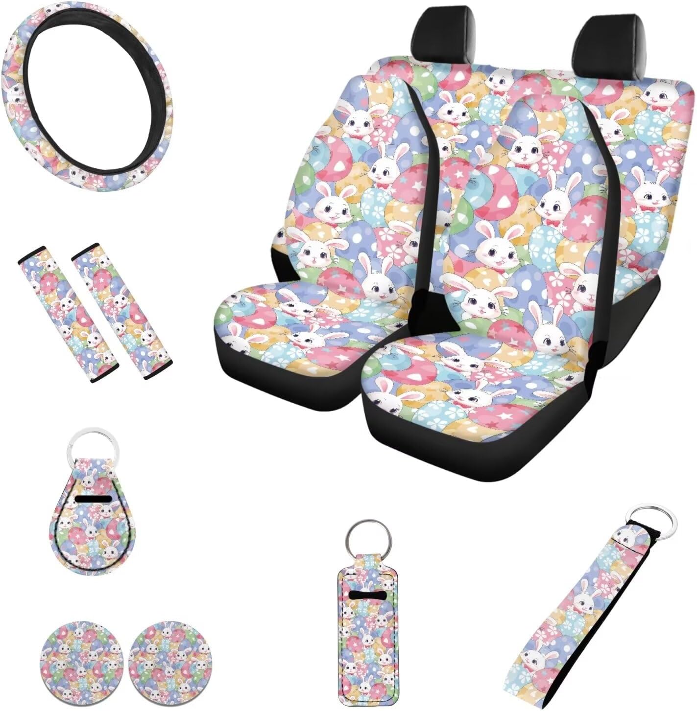 12 Pcs Car Seat Cover Full Set Interior Protective Accessories Car Seat Cover Set:Comfotable,Anti-dirt,Soft.Our beautifully designed seat covers will make your life more easier.Car seat cushion can protects your car, truck and van from dirt, stain and spill.It is also a nice decoration for your car which makes you and your friends family enjoy the long trip.Comfotabele,Anti-dirt,Soft.Makes a Great Gift for Family and Friends; Great for Families with Children and Pet Owner. Car Steering Wheel Cover: The beautiful print and cute pattern on your steering wheel will make you find the car more easily in the parking, and it will bring a great touch to the interior of any car, making every trip not only enjoyable but comfortable as well Car Seat Belt Pads: Great for protecting your shoulder and reducing the pressure from the safety seat belt, Provides comfort and helps relieve chafing. Car Keychain:The hand wrist keychain help you no Longer Lost Key,easy to find your chapsticki.It is a perfect gift for Easter Gift Car Cup Holder Coaster:The neoprene car cup pad is waterproof and quick-drying, avoids the long-time worry from being wet by drinks; Vehicle Hand wrist keychain on the back of the elastic rubber material,pull is not easy to break.Hand wrist keychain ensures that you can always get the key when you need it.It is very easy to find the key in the wallet to prevent your key from losing. Lipstick Holder Key Chain:9.6x4cm/3.7x1.5in,Fabric and stitching, neat seams, durable, metal key chain that can protect and decorate your lipstick without worrying about the bag Can't find lip balm Package: 2 Pieces Car Front Seat Covers 2 Pieces Car Rear Seat Cover 1 Pcs Car Steering Wheel Cover 2 Pieces Car Seatbelt Pad Shoulder Strap 1 Pcs Car Keychain 2 Pieces Car Cap Holder Coster 1 Pcs Lip Balm Holders Sleeve 1 Pcs Car Lanyard Keychain
