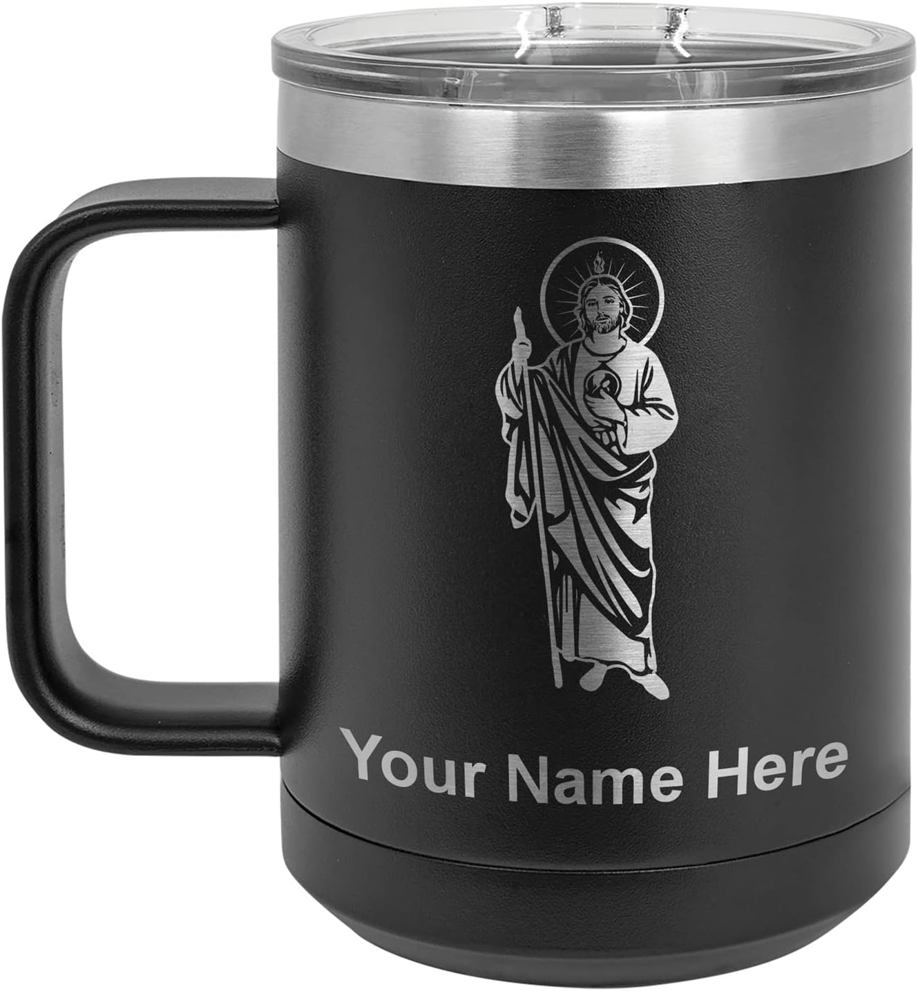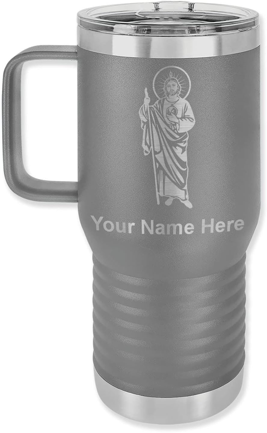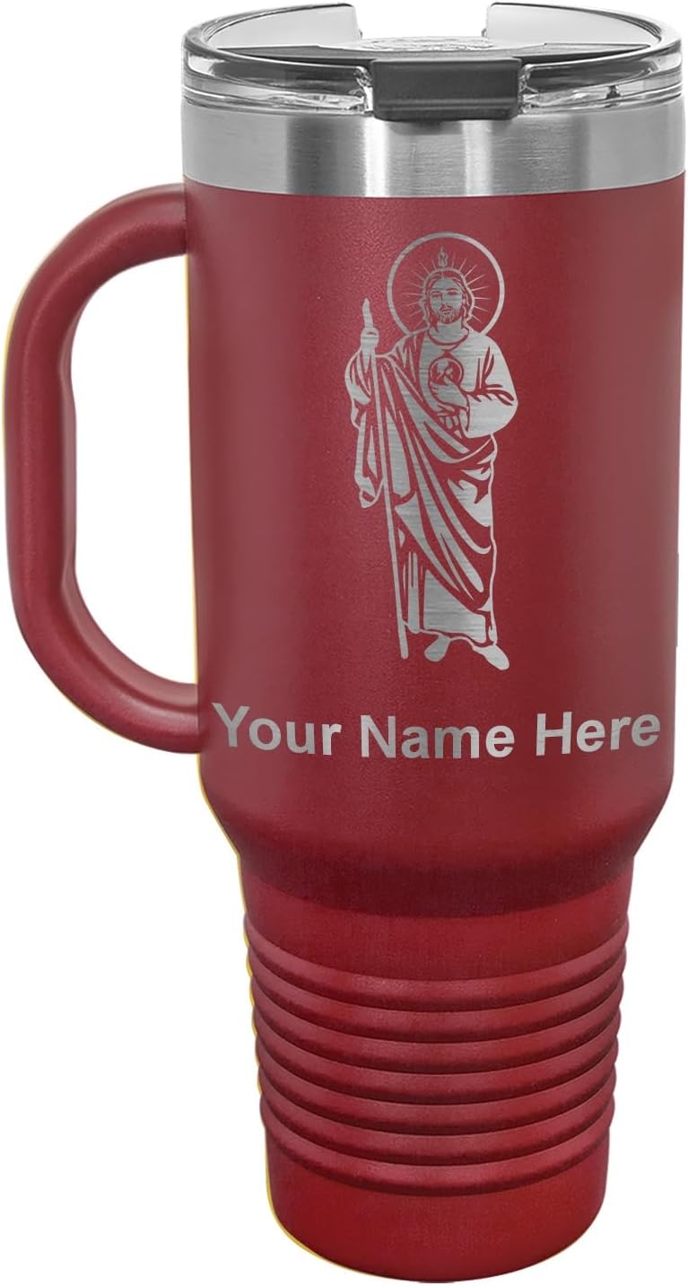 LaserGram 40 ounce Travel Mug with Handle that is laser engraved with the image that you see in the photo. Your own personalized text will be laser engraved below the image. Features double-walled stainless steel vacuum insulation with a clear lid. Click the "Customize Now" button to begin customizing your mug.