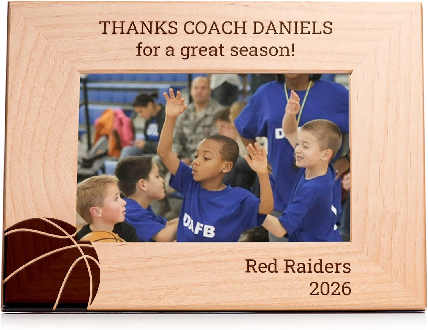 Our basketball coach picture frame from Lifetime Creations is the perfect way to say thank you to your team's coaches for their time and dedication. Show your heartfelt appreciation to your youth or high school basketball coach with this distinctive, quality engraved wood frame. It’s made from alder wood, and is complete with a glass covering for your picture and a white gift box. Show your coaches how much you appreciate them with a one-of-a-kind gift that features a basketball laser engraved in the bottom corner of the frame and "Thanks Coach for a great season" on top. The laser engraving contrasts beautifully against the light wood. Add a team photo or your favorite action shot from game day to the picture frame, and give to the head coach at the end of season party or senior night. With this thoughtful and personalized gift, your coach will be reminded of the incredible achievements and memories created together with the team. Our basketball coach picture frame is the perfect way to honor your head coach or assistant coach's unwavering dedication and inspire them for the seasons ahead. Show your gratitude and admiration with this unique and meaningful gift.