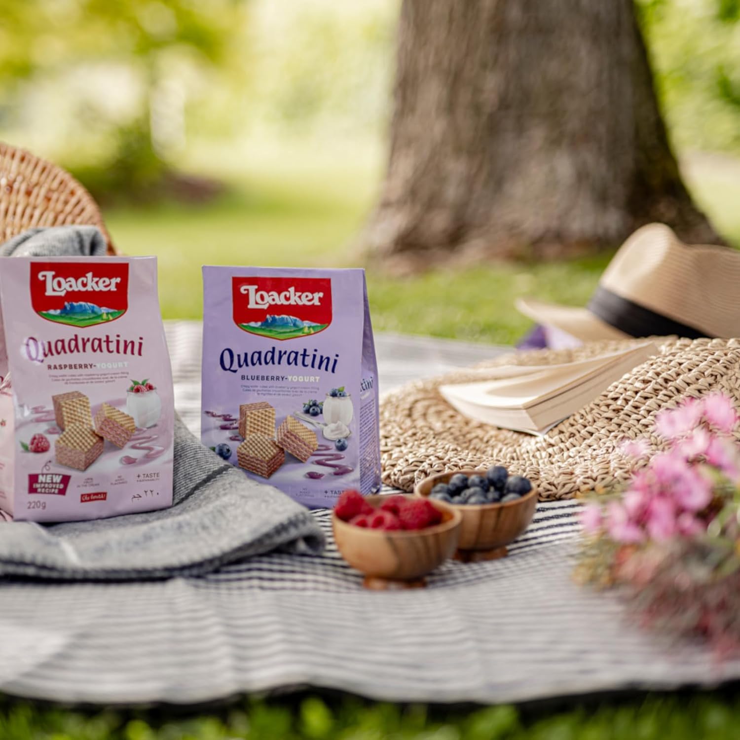 Loacker Quadratini Raspberry Yogurt: cream filled wafer cookies. This cube wafers multipack contains 6 family size resealable bags. Experience the taste of summer. The secret of these exquisite cubes is the refreshing raspberry-yogurt cream. The raspberries, sun-ripened in fertile soils and strictly Non-GMO, are exclusively grown in the open air. The yogurt is made from 100% Non-GMO Alpine milk. This resealable bag contains 55 bite size premium wafer cookies filled with finest Raspberry-Yogurt cream. Loacker Quadratini are ideal for sharing with friends and loved ones or perfect to enjoy by yourself with a cup of tea or ice tea.