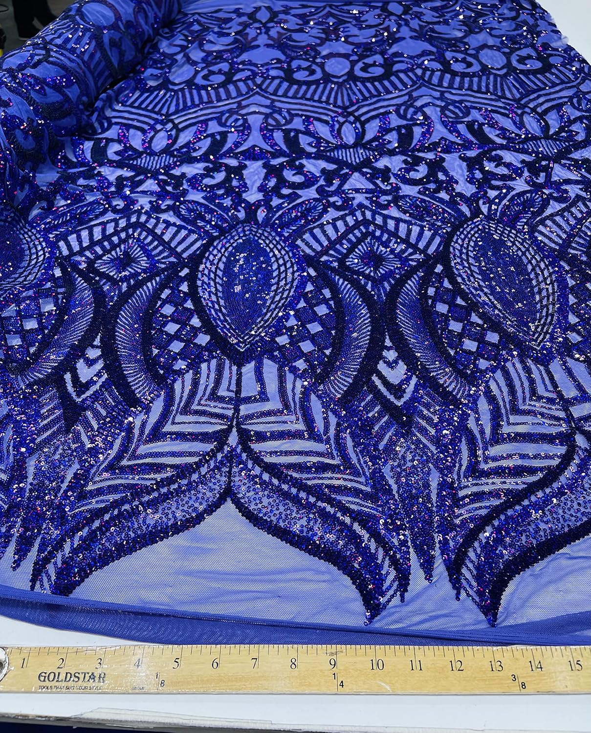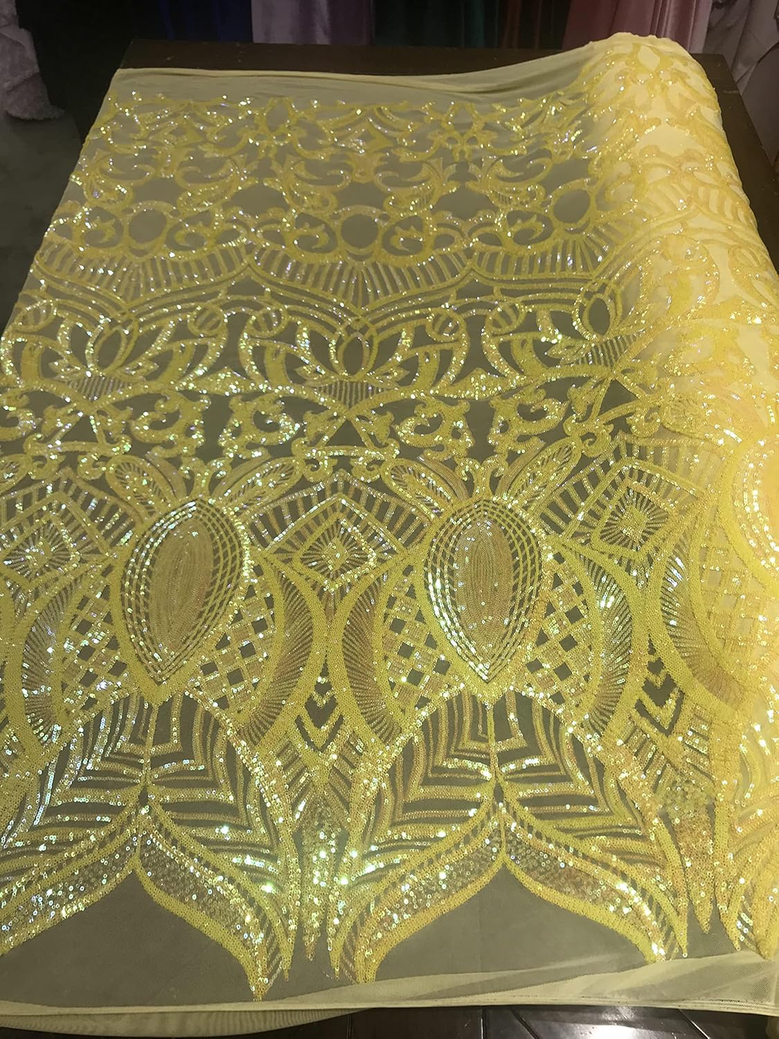 This ROYALTY design is embroidered with iridescent Sequins on a 4 Way Stretch mesh fabric. The iridescent Sequins has especial and extraordinary design on the Mesh . It is super elegant and classy, The royalty design embroider with iridescent Sequins on a mesh can be use for dresses, tablecloths, night gowns, Skirts, prom dresses, wedding dresses, runners for tables, decoration and much more.