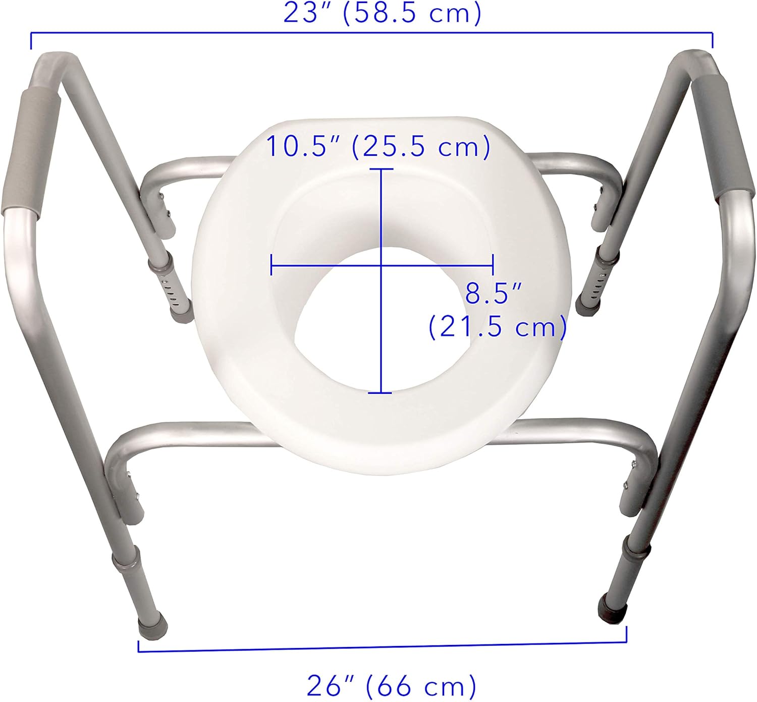 The PCP 2-in-1 extra-wide toilet safety frame and commode rail provides sturdy support for individuals with special needs, making their trip to the bathroom a safe one. Features a full 5 inches of additional width compared to our previous model. Total width between arms is 23 inches). elderly or individuals with limited mobility, arthritis, balancing issues, back or knee injuries will be able to use the toilet independently. The toilet handrails for seniors prevent slips and falls for peace of mind. Our toilet handrails are FDA cleared, the highest standard in medical toilet rail. Supports up to 300 lbs. A unique product that does double duty as a commode safety frame and raised Toilet Seat. Use for: bath safety, recovery, post-injury, limited mobility, and daily living aids. Sturdy 1" (2.5 cm) frame. Molded plastic seat and encircling splash guard fixed to frame; easy to keep clean. Vinyl hand grips/ arm rests and silencer rings. Proudly made in the USA.