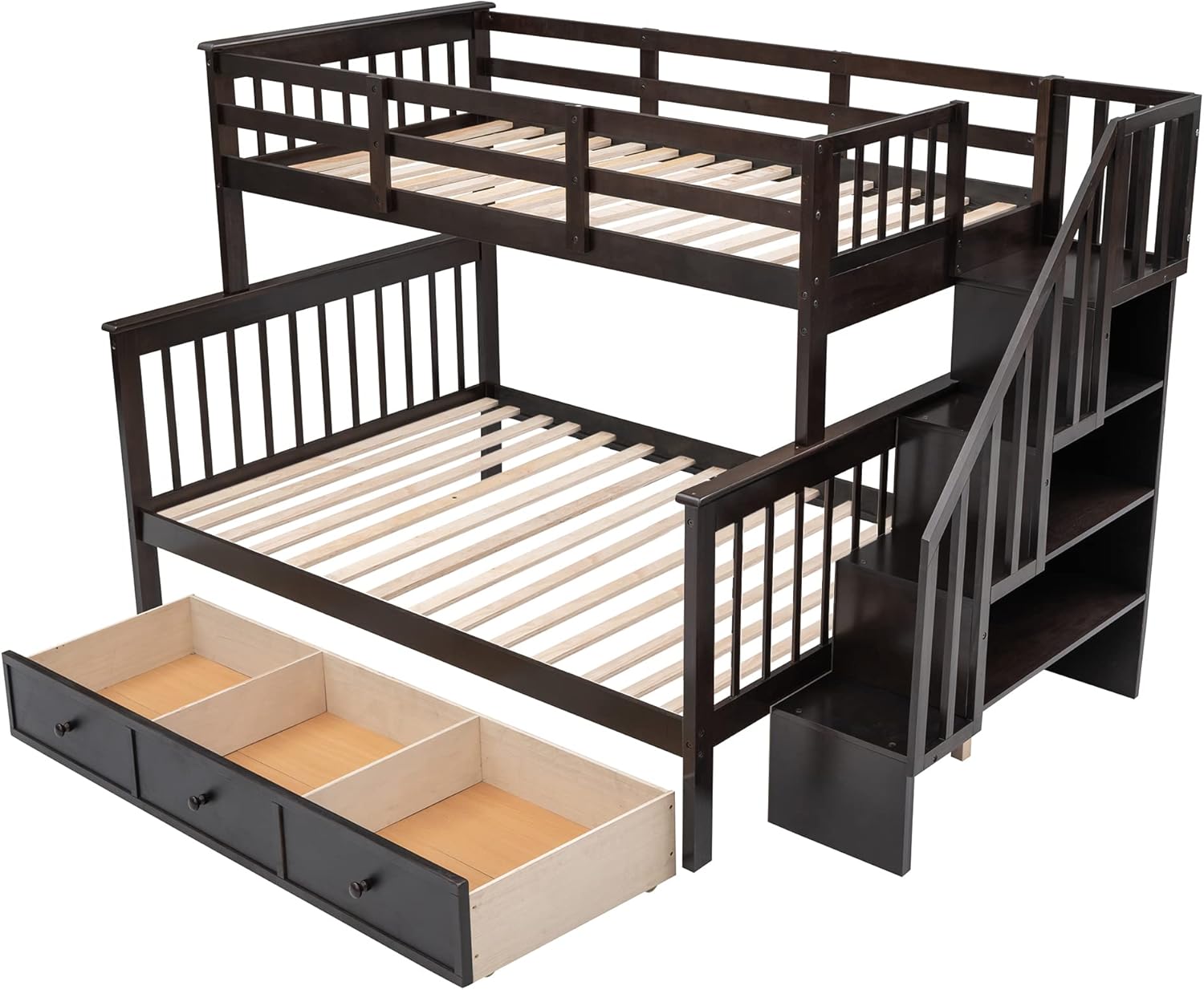 If you need extra sleeping space or your family love sleepovers, this Stairway Twin-Over-Full Bunk Bed with Drawer is perfect for your home. Four open shelves located beneath the attached staircase provide ample storage for your family’ toys and bedding. High-quality, solid pine legs and a strong, durable frame ensures stability and durability for long-term use, and can be separated into one twin,one full-size bed. Slat kit included so box springs are not required. This bunk bed is designed with a clean silhouette and a hue of elegance. It suits all styles of home decoration, and completes the look of any bedroom.Weight & DimensionsOverall Product Dimension: 91.73"L x 54.33"W x 61.4"HDetail Product Dimension: Please refer to the Size imageNumber of Package: 3Overall Product Weight: 207.2LBSWeight CapacityUpper bed: 200LBSBottom bed: 250LBSRecommended Mattress ThicknessUpper bed: 6" (Mattress not included)Bottom bed: 8" (Mattress not included)Specifications:Product Type: Bunk BedSize: Twin-Over-FullColor: Grey/White/EspressoMaterial: Plywood+MDF+PinewoodBox Spring Required: NoNumber of Slats: Upper bed: 14Bottom bed: 14Assembly Required: YesCountry of Origin: VietnamProduct Warranty: One yearNotes:Manual measurement has been used,there may be some reasonable error.All the pictures are taken by actual samples, slight chromatic aberration may occur due to lighting or display.