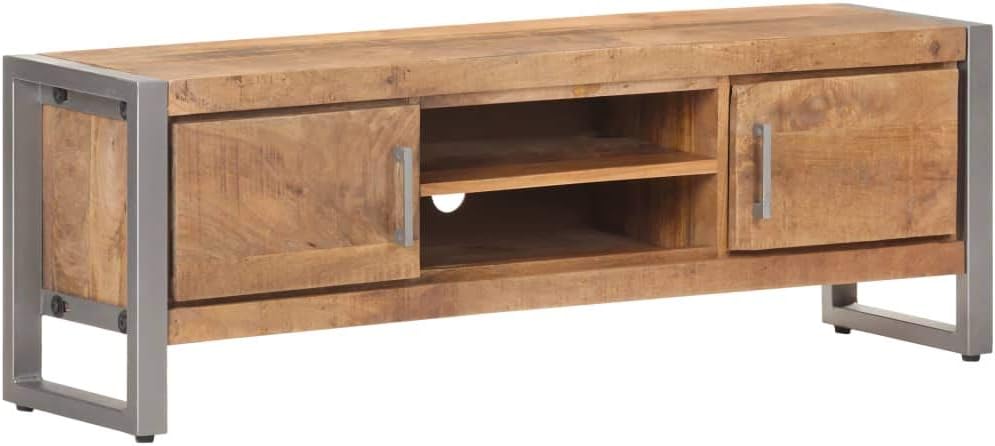 This wooden TV cabinet has an industrial style and makes it a great choice for your interior living space.The stereo cabinet is made of rough mango wood, a tropical hardwood with the strength to bear the weight. It also stands the wear and tear of time, making it stable and durable. The iron frame also adds extra stability. The media unit also features two doors and two compartments providing ample storage space.Important note: Colors and grains vary from piece to piece, making each piece unique. The delivery is random, ensuring the exclusivity and individuality of your product.Material: Rough mango wood with a natural finish, iron with gray finishDimensions: 47.2" x 11.8" x 15.7" (W x D x H)Assembly required: YesCalifornia Proposition 65