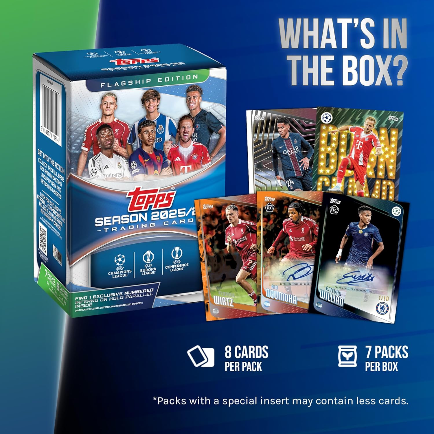 Topps UEFA Club Competitions makes its return for the 2025-26 season, kicking off a brand-new year of hobby products for the most exciting soccer competitions in the world! Topps’ flagship release goes even higher with the 2025-26 edition, bringing revamped chase inserts, new autograph subsets and plenty more - all of it featuring the game’s top veterans, legends, and a brand-new rookie class already making its impact on the field! The 200-card base set, chock full of the competitions’ greatest players and brimming with newly-emerging rookies, is joined by a host of updated inserts. Roots, Born Champ and 8Bit Ballers also join the lineup, bringing more color and character to every pack!