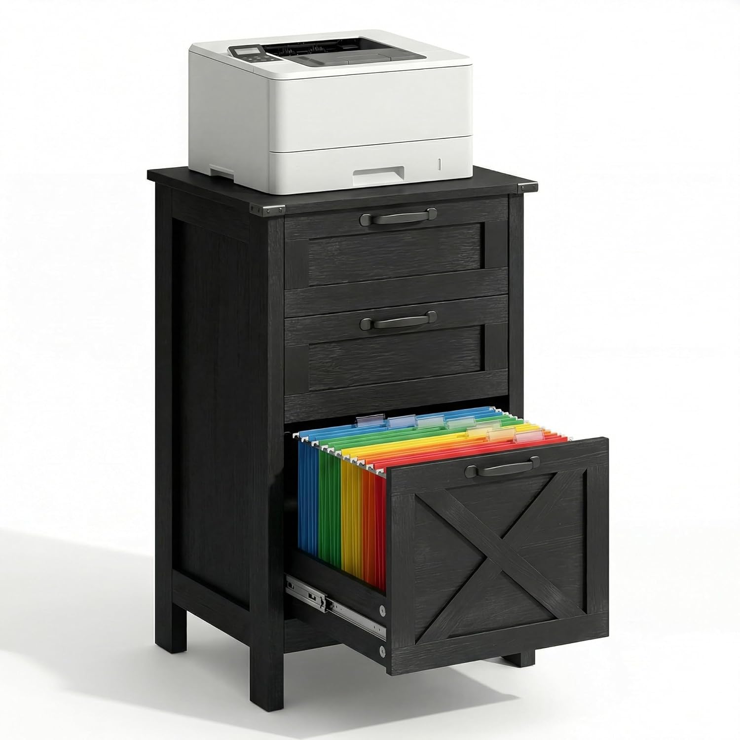 "DSAFGGY 3-Drawer Farmhouse File Cabinet: Where Strength Meets Style Upgrade your workspace with a filing cabinet that is built to last. The DSAFGGY Vertical Cabinet stands out with its extra-thick wood boards, providing a solid and heavy feel that guarantees durability. Whether you are using it to archive 100+ documents or as a robust printer station, this cabinet won't let you down. Rock-Solid Performance: Supports up to 150 lbs on top. Rustic Brown Finish: A beautiful farmhouse look that fits any decor. Smart Storage: A dedicated file drawer plus two utility drawers."