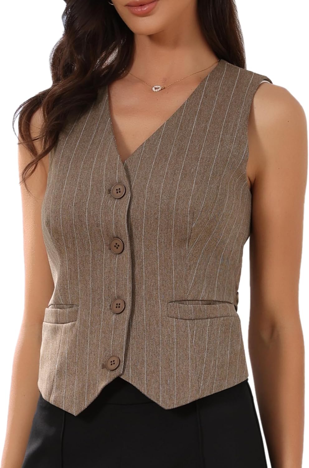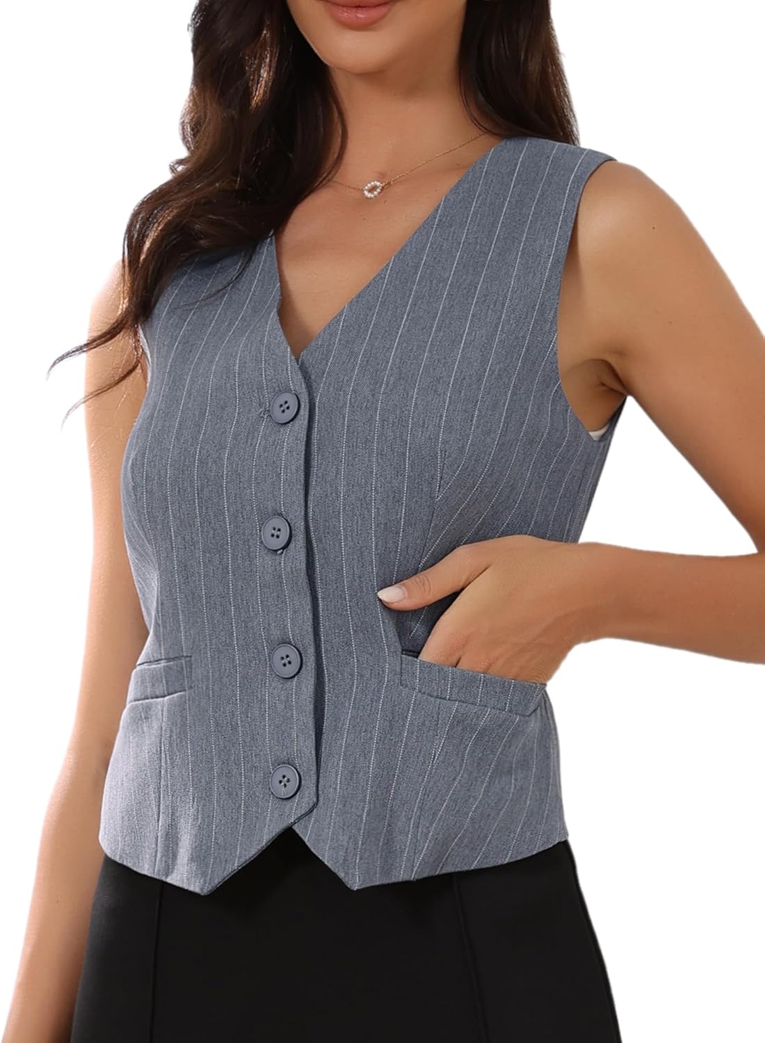 Vest Waistcoat Tops for Women V Neck Sleeveless Button Down Striped Trendy Top Ladies Business Casual OutfitsThis V-neck sleeveless striped waistcoat features a button-down front and convenient pockets, adding functionality to your outfit. The classic stripes and stylish design make this vest a versatile piece for various occasions. Stay on-trend and chic with this fashionable addition to your wardrobe that effortlessly combines style and practicality.