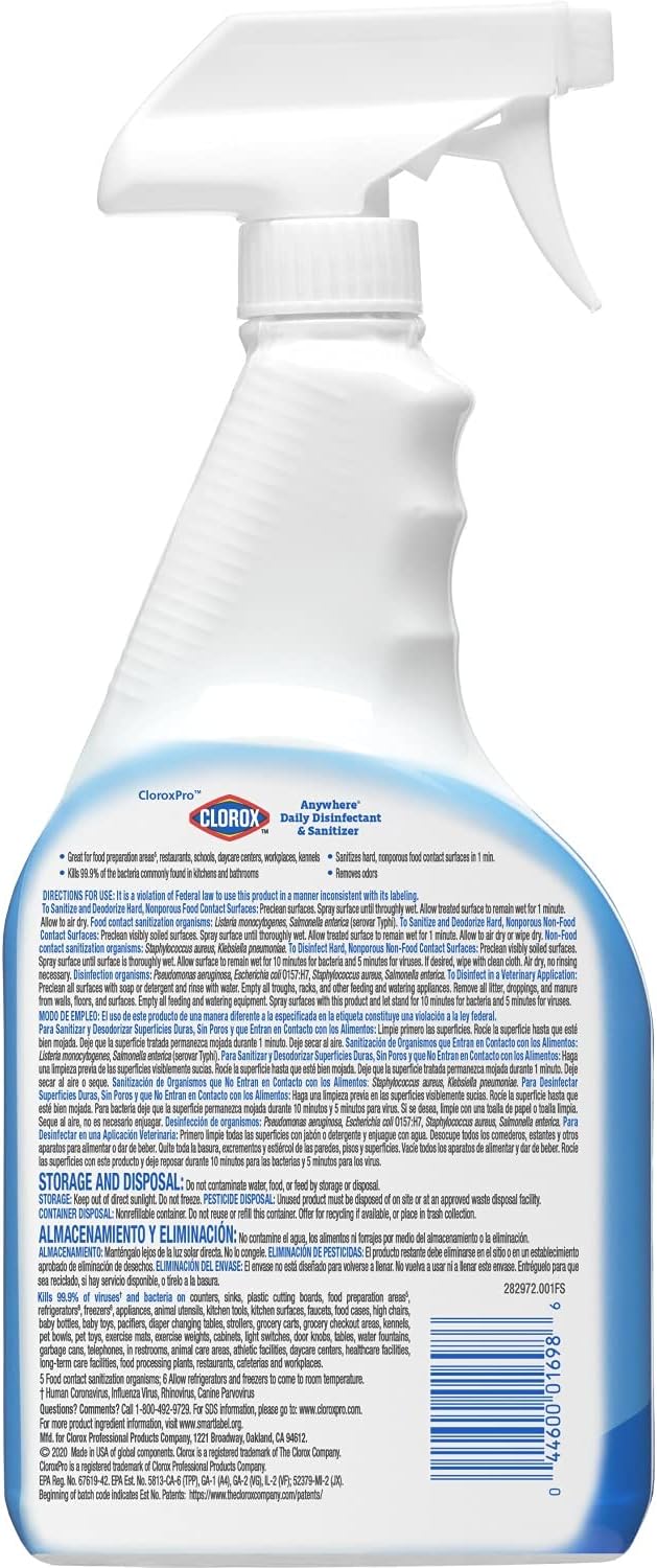 CloroxPro Anywhere Daily Disinfectant and Sanitizer is designed to disinfect hard nonporous and food contact surfaces. Certified by NSF*, CloroxPro Anywhere Daily Disinfectant and Sanitizer kills cold and flu viruses** & 99.9% of bacteria***, including Salmonella, Staph and E. Coli. As a hypochlorous acid based formula, the cleaner is tough on bacteria yet mild enough to use around kids, pets and food, thanks to its low odor and no residue. It allows you to sanitize without rinsing, leaving only the clean smell behind. This Clorox spray comes in a trigger spray bottle and is well suited for commercial spaces like hospitals, public restrooms, daycare centers, hotels, kennels, institutional kitchens, laundry rooms, offices and schools. *Nonfood Compound. Category D2. Reg. No. 162863. CloroxPro, where clean means everything. **Human Coronavirus, Influenza Virus, Rhinovirus, Canine Parvovirus. ***Salmonella enterica, Staphylococcus aureus, Escherichia coli 0157:H7.