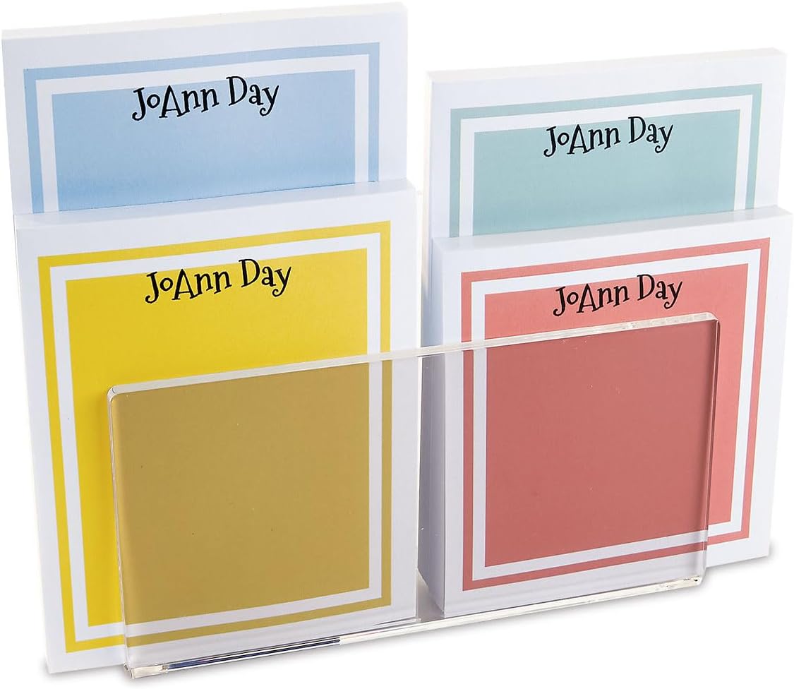 Show your teacher appreciation! Our Yellow Pencil personalized notepad sets are great anytime gifts to share with teachers and educators. You’ll be top of your class. Great for notes, short memos, to-do lists, and jotting down quick information. Personalized for you. Set of 4 sizes, 100 sheets per pad, gift packaged. Specify name up to 18 characters. Sizes are: 4 1/4" x 4 1/4" 4 1/4" x 5" 4 1/4" x 6" 4 1/4" x 6 3/4" Acrylic notepad holder is 7"W x 4 1/2H x 3 1/2 bottom