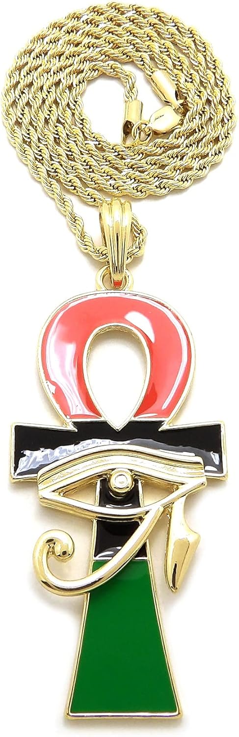 Icemond Eye of Horus on Pan African Color Ankh Pendant 16"/18"/20"/24" Box, Cuban, Rope Chain Necklace in Gold or Silver Tone