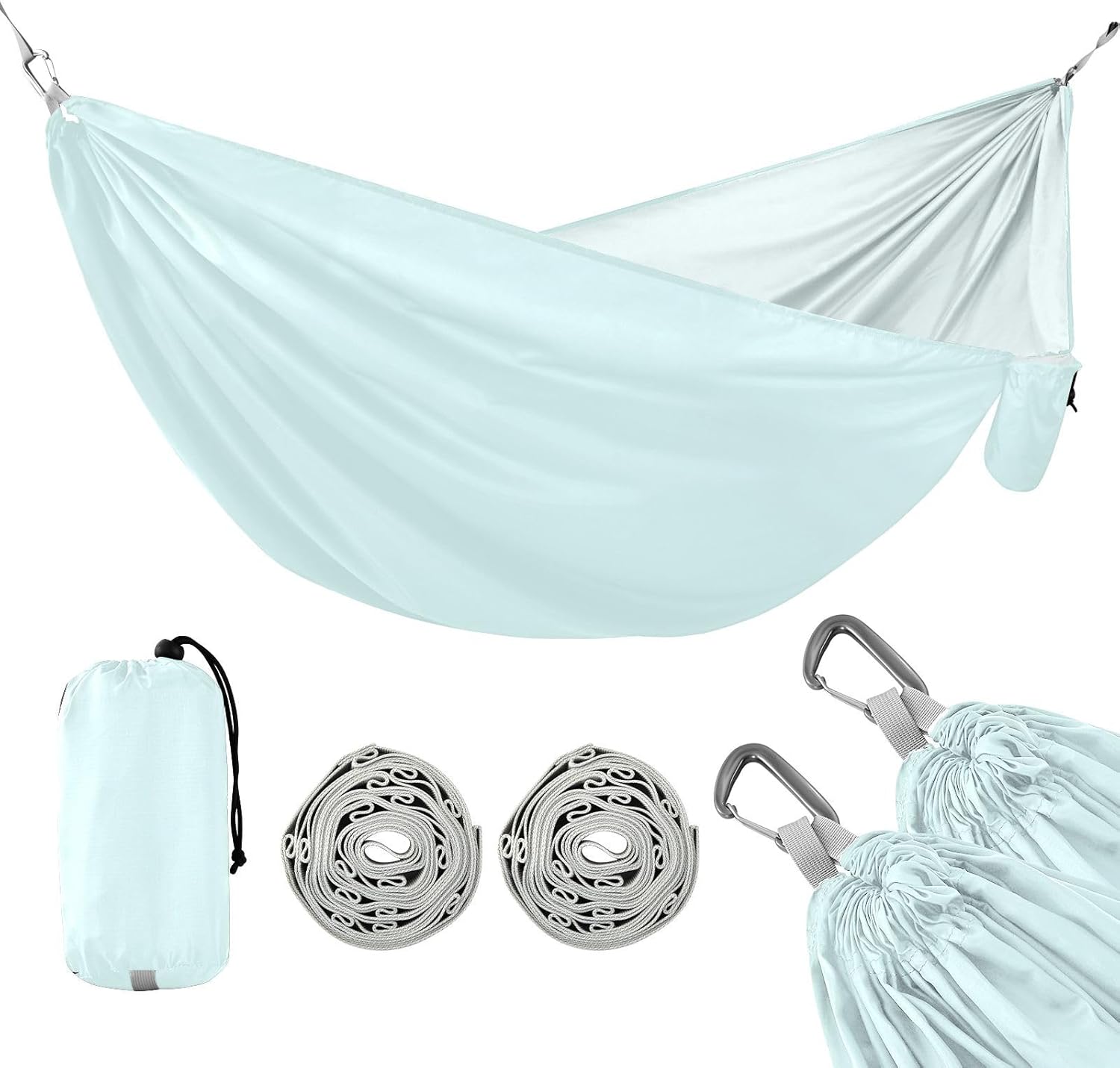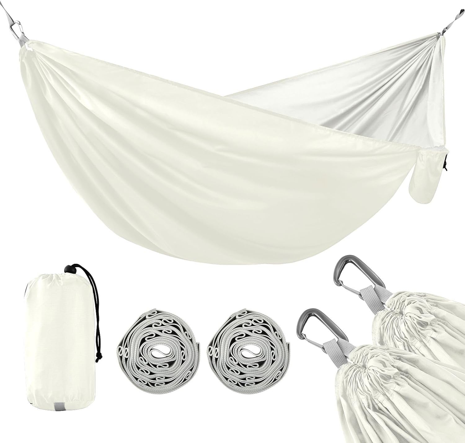 Take a break from the trail, hang between the trees, and feel the world slow down. This camping hammock is built for moments like these—and packed with features that make every outdoor rest effortless, safe, and comfortable.Built to Last — 210T Ripstop PolyesterMade from premium 210T polyester taffeta, this hammock is tear-resistant, breathable, and quick-drying. It holds up to 390 lbs (183 kg), offering reliable support whether you're deep in the woods or relaxing by the lake.Hang Anywhere, InstantlyIncludes two 2-meter high-density 600D tree straps and aluminum alloy carabiners. Multiple adjustment loops let you set up in seconds—no knots, no stress. Just clip, adjust, and relax.Lightweight & Adventure-ReadyWeighs only 490g and folds into a compact pouch that fits in your backpack or glove box. Take this portable hammock wherever you go—camping, hiking, beach trips, or even backyard escapes.Room to Stretch, Space to BreatheMeasuring 114" × 54.3", this Outside Hammock offers generous space for one person to lie flat and truly unwind. Whether it's a quick nap or an afternoon read, you're wrapped in comfort.Smart Details Make the DifferenceFeatures a built-in side pocket for your phone, flashlight, or trail snacks—because comfort means having everything right where you need it.From the mountains to the backyard, this camping hammock is your go-to gear for rest, recovery, and reconnection with nature.