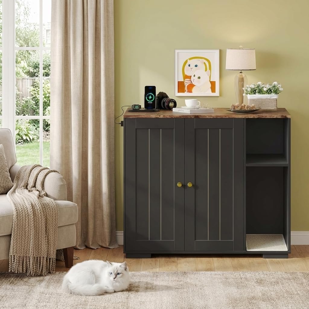 Take the litter box out of sight without making life harder for you or your cat. This large litter box cabinet offers a generous 27.75"L x 24.8"W x 30.3"H interior, sized to fit many popular automatic models and standard self‑cleaning boxes up to 30" high. You still have full access to doors, control panels, and waste drawers, so daily upkeep stays simple. A built‑in barrier shelf creates a cat‑only entrance that helps keep curious dogs out, giving your cat a quieter, more private place to use the box. At the doorway, a removable non‑slip mat catches tracked litter before it hits your floors, cutting down on sweeping and vacuuming. Inside the cabinet, dual AC outlets and two USB ports with a 5 ft power cord act as a dedicated power hub for the litter box and other pet devices, while the integrated power module keeps cables routed neatly instead of spilling out everywhere. On the outside, the enclosure looks like a modern cabinet or side table, with a flat top for lamps, decor, or books. In a living room, bedroom, hallway, or small apartment, it blends in with your furniture, adds extra storage and surface space, and turns your cat’s litter area into a clean, organized part of your home rather than something you try to hide.