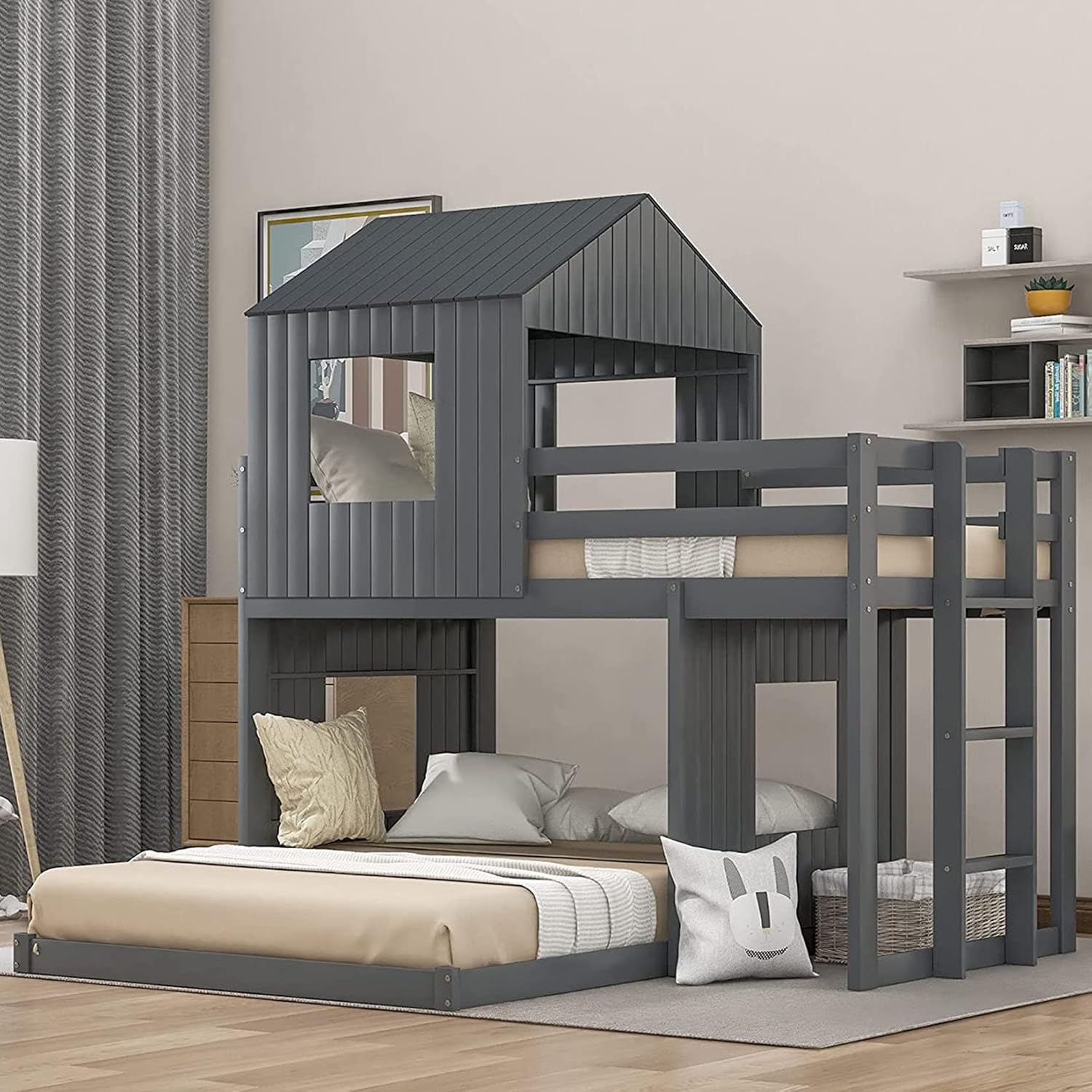 Wooden Twin Over Full Bunk Bed, Loft Bed with Playhouse Give the family in your life a playhouse that will bring hours of fun combined with a fully functional bunk bed for the perfect two-in-one bedroom addition. With a design loved by parents and family alike, this bunk is completed with a simple silhouette and natural weathered wood grain to serve as a tasteful statement piece in your family bedroom that they can enjoy for hours on end. Crafted as a cabin-inspired playhouse with square windows on the top and bottom bunk and the slide on the side, this bed doubles as a semi-enclosed play place to let the imagination of your family run wild. Enjoy this bunk for years to come with its durable build, manufactured with quality lumber and pinewood to withstand horseplay, scratching and other untimely wear. Assemble according to your personal preference, with assembly options allowing for the bottom bed to be on the left or right side in accordance to your room layout. Comes complete with thick slats to preserve the life of your mattress. Weight & Dimensions Overall Product Dimension: 82.1"L x 89"W x 82.3"H Number of Package: 3 Overall Product Weight: 193.65LBS Weight Capacity: Upper bed: 400LBS Bottom bed: 600LBS Recommended Mattress Thickness: Upper bed: 6" Bottom bed: 8" Recommended Age: > 6 years old Specifications Product Type: Bunk Bed Size: Twin-Over-Full Color: White/Gray/Antique Gray Material: Plywood+MDF+Pinewood Number of slats: Upper bed: 14 Bottom bed: 7 Box Spring Required: No Assembly Required: Yes Country of Origin: Vietnam