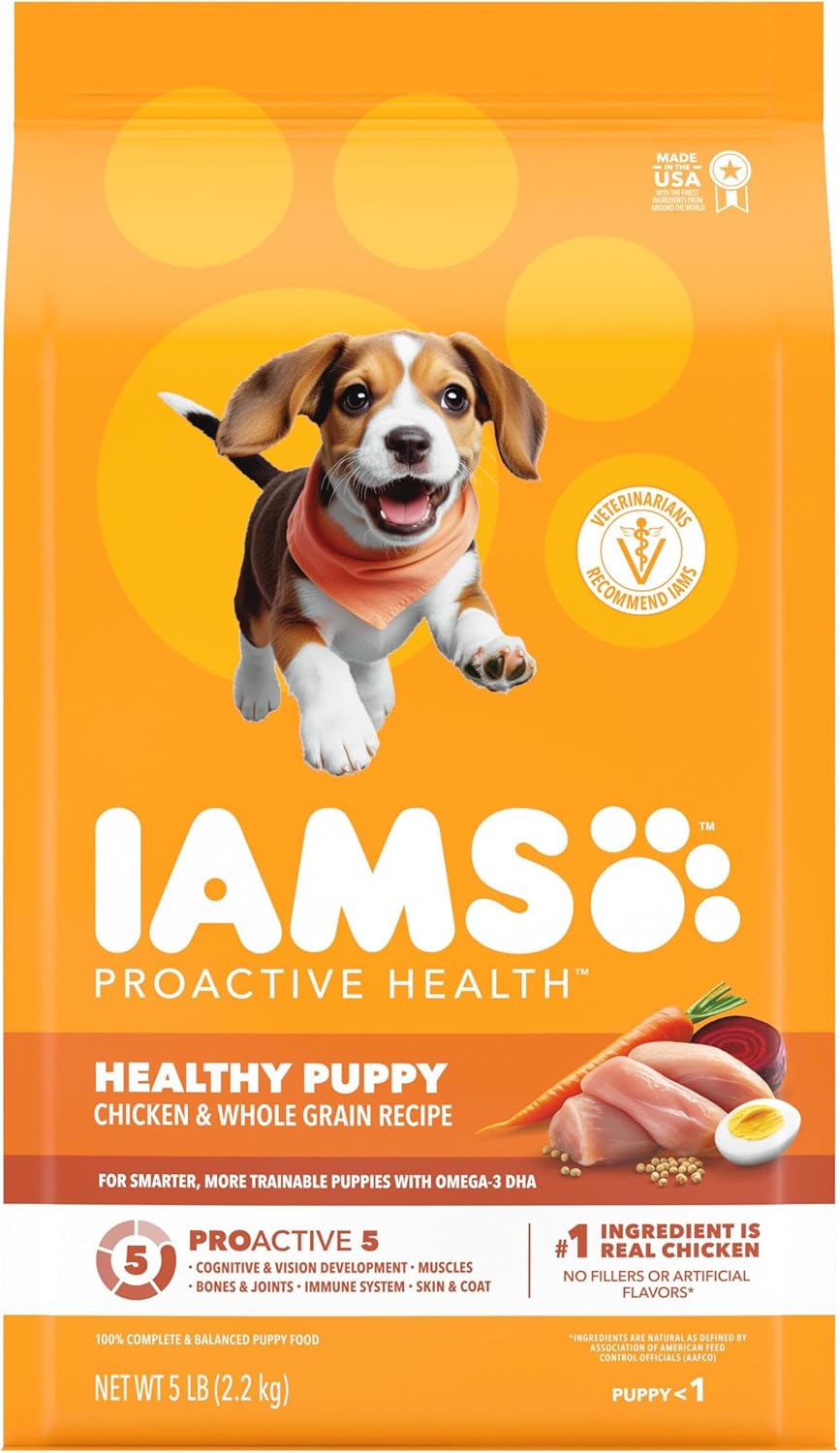 Veterinarians recommend IAMS. IAMS Proactive Health Smart Puppy Dry Dog Food with Real Chicken is made with real chicken as the #1 ingredient and contains no fillers or artificial flavors; ingredients are natural as defined by the Association of American Feed Control Officials (AAFCO). This dog food IAMS recipe delivers the Proactive 5 health benefits that focus on healthy muscles, energy, digestion, immune system, and skin and coat. Formulated with essential nutrients to support healthy bones and joints, the dog dry food kibble helps ensure that your puppy has a strong foundation for life. Made with Omega-3 DHA for smarter, more trainable puppies, the recipe supports cognitive development during this crucial growth stage. The optimal ratio of omega-6 and 3 fatty acids aids healthy skin and coat so your puppy looks and feels great. Enriched with essential antioxidants, the pet food helps puppies develop a strong immune system. This IAMS dog food dry formula also provides high-quality protein from chicken and egg that helps develop strong muscles, crucial for an active and playful lifestyle and gives pet parents and dog owners focused on canine health a reliable option. Choose IAMS puppy food for daily feeding to help your pet grow into a healthy, happy, and active adult dog.