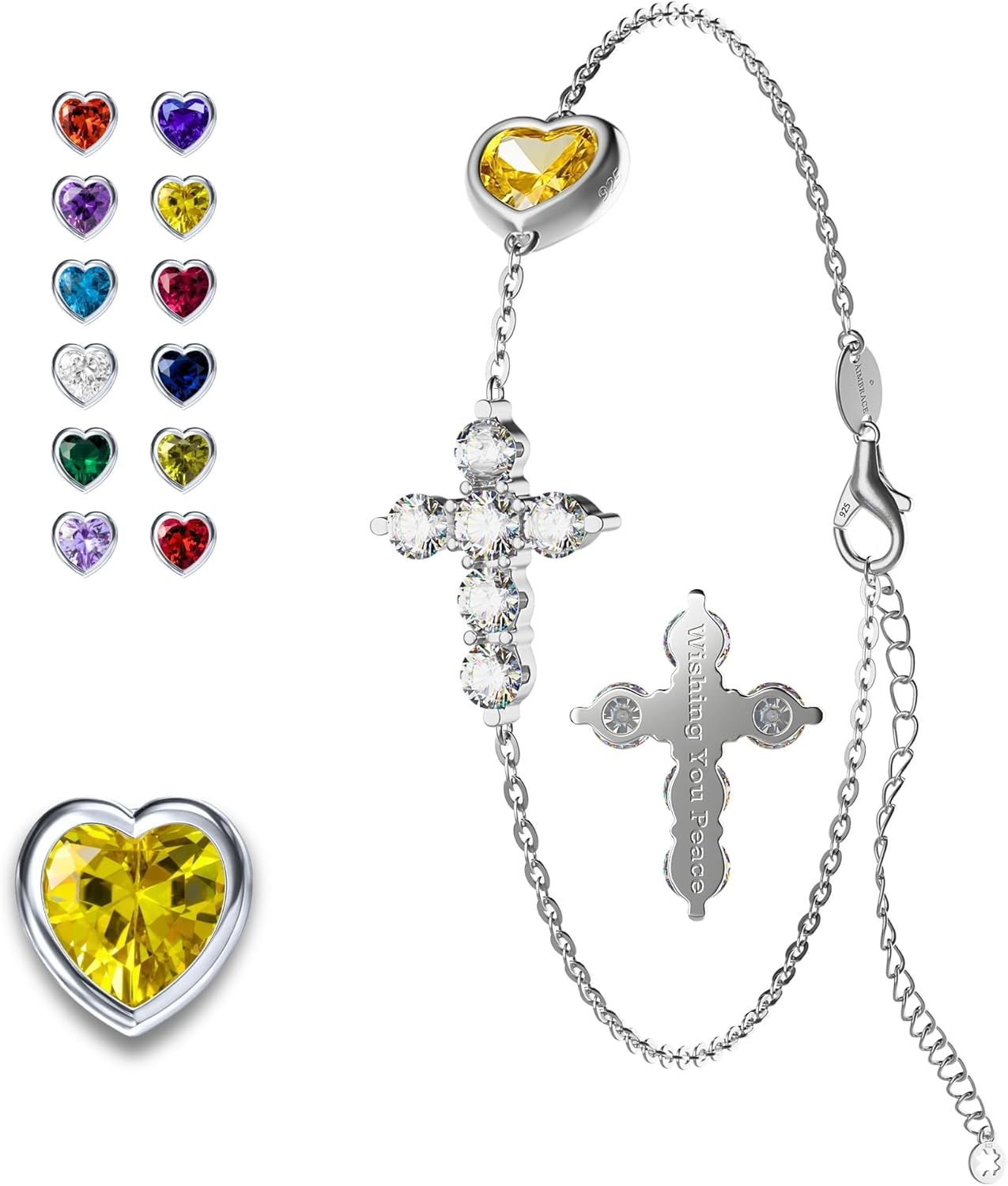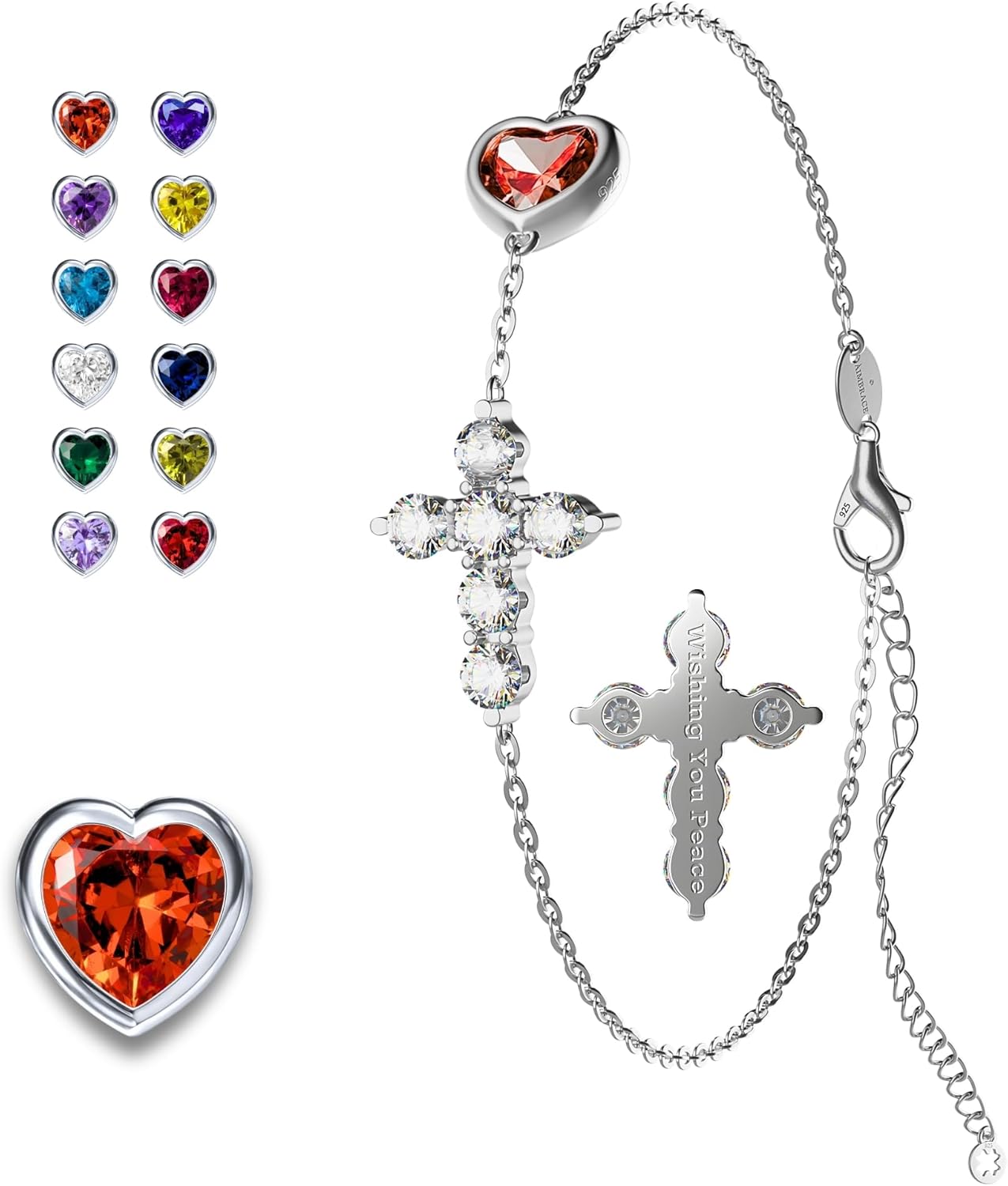 Elegant, symbolic, and effortlessly polished, this refined bracelet brings together three meaningful details in one sleek silhouette: a moissanite cross for peace and protection, a heart-shaped birthstone for love and personal connection, and a subtle clover accent for good fortune. Crafted in 925 sterling silver and finished with luminous rhodium plating, it reveals an icy-white radiance that feels fresh, modern, and easy to style from day to night. The slim chain and delicate proportions create a look that is light, feminine, and versatile, while the adjustable extension allows for a comfortable fit. Balancing sentiment with contemporary elegance, the design feels both personal and fashion-forward, making it an effortless finishing touch for everyday dressing as well as special occasions. The clean lines of the cross catch the light with refined brilliance, while the heart-shaped birthstone introduces a vivid pop of color that feels expressive without overwhelming the silhouette. Paired with the understated clover accent, the bracelet feels graceful, distinctive, and full of meaning. Its polished finish and fluid profile make it easy to wear alone for a subtle statement or layered with other favorites for a more curated look. Beautifully presented in gift-ready packaging, it makes a thoughtful choice for birthdays, holidays, anniversaries, or simply as a personal keepsake to wear and treasure every day. Romantic yet modern, it is designed to bring light and intention to every look.