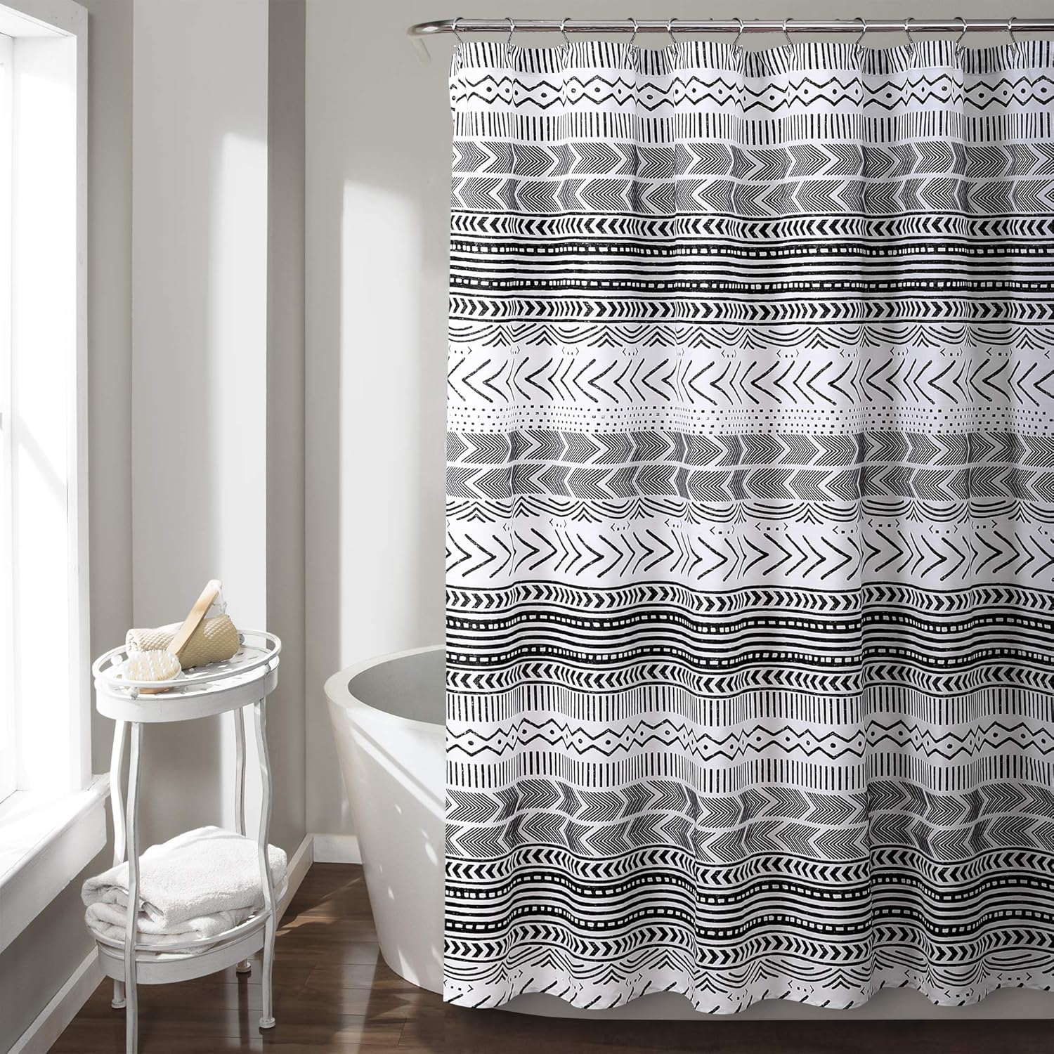 Add subtle depth to your home decor with the Hygge Geo Shower Curtain. This striped bedding set features rows of various geometric shapes and patterns, embracing the Scandinavian decor style. Decorate your primary, guest, or child's bathroom with this white and black bath curtain, its the perfect addition to a minimalist or Scandinavian decor style. This geometric shower curtains for bathroom measures 72 inches wide by 72 inches long and is crafted from a soft microfiber fabric. The 12 button holes at the top of this bathroom shower curtain make it easy to hang with hooks or rings (not included). Because this is a fabric shower curtain, we recommend pairing it with a liner, sold separately. Easy care machine washable.