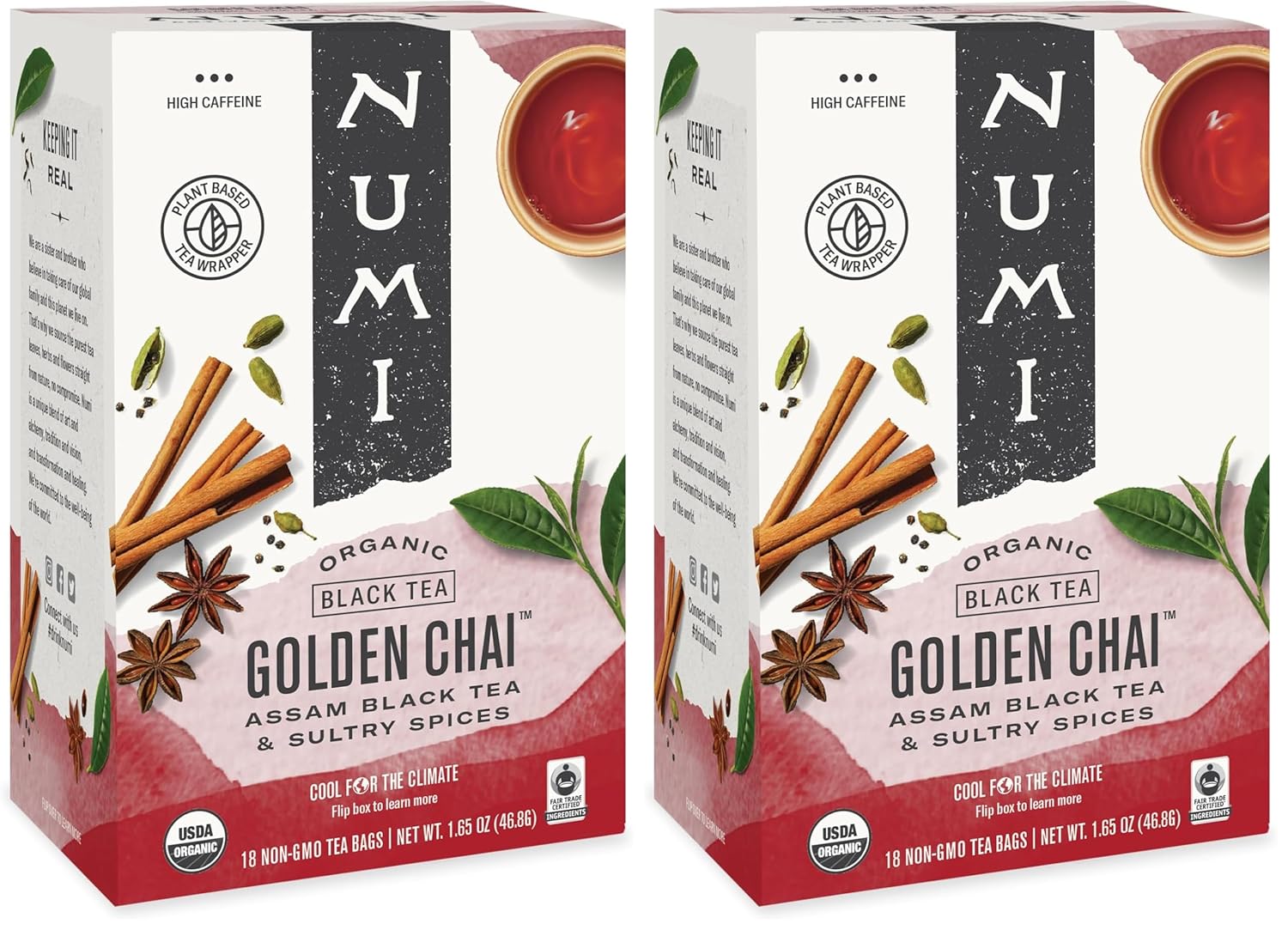 Numi Organic Tea's Golden Chai is a traditional Indian treasure. A rich and spicy blend of organic, hearty Assam black tea and organic cinnamon, cardamom and ginger, this tea is great with milk! Throughout India, chai stalls are a meeting place for provocative tea and conversation. From its homeland in China, cha has journeyed as chai, thé, and tea, recreating itself in every land. Numi's golden brewed, organic Chai fuses rich cultures in a complex and hearty Assam black tea. The workers at this organic tea estate in Assam, India have allocated their Fair Trade funds towards school scholarships, new roads, mosquito nets and women’s self-empowerment programs. About Numi: Numi is a labor of love by a brother and sister. She is the artist and he is the alchemist behind all of Numi’s blends. Their exceptional-tasting teas are captured in unique blends that use the highest quality organic, non-GMO ingredients sourced directly from Fair Trade Certified gardens. Numi combines premium full-leaf quality teas and herbs with only 100% real fruits, flowers and spices. “Through authenticity, creativity, and commitment to people and planet, Numi brings you the purest, best tasting organic tea”