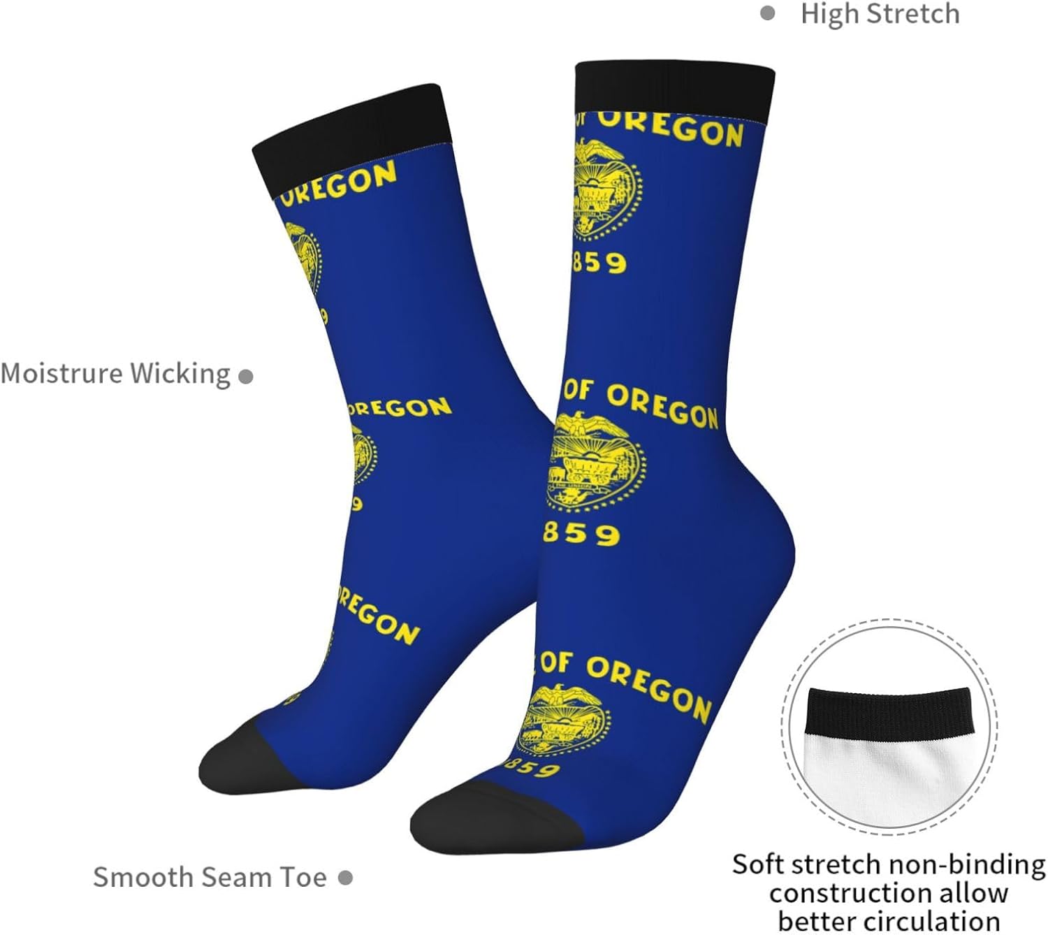 Oregon State Flag These socks are made from a blend of 95% polyester and 5% spandex, offering a skin-friendly and comfortable feel with excellent moisture-wicking, breathability, and pilling resistance to keep feet dry at all times. The spandex provides ample elasticity, ensuring zero pressure on the feet, while the stylish black toe adds a touch of trendy sock quality. The socks feature an all-over print design; avoid extremely fine fonts or patterns to ensure optimal print quality. Combining warmth and style, these socks are suitable for both everyday wear and sports, and come in sizes that cover most foot lengths (36-45cm). They are a versatile accessory that combines comfort, fashion, and practicality.