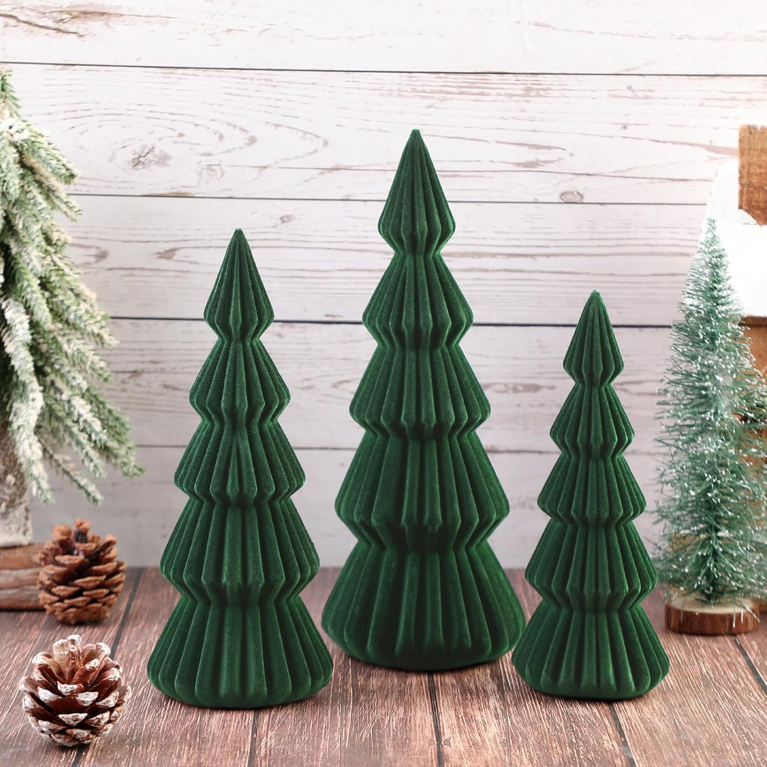 Features: Classic Christmas color: Our velvet Christmas trees for tabletop come in a vibrant, classic Christmas cream white color which stands out in most room. The color radiates festive charm, making these Christmas trees an attractive holiday addition to space. They can totally match your other Christmas home decors. Wide applications: These velvet Christmas decorations indoor aren't just for your living room. Vibrant and eye catching, they're suitable for decorating offices, classrooms, supermarkets, and more. Classic yet elegant, they're an ideal way to enhance a wide variety of settings with some Christmas joy. Specifications: Material: velvet Color: cream white Size: Large velvet Christmas tree: 11.81 inches/ 30 cm Medium velvet Christmas tree: 10.24 inches/ 26 cm Small velvet Christmas tree: 8.66 inches/ 22 cm Package includes: 3 x Velvet Christmas tree Notes: Manual measurement, please allow slight errors on size. The color may exist a slight difference due to different screen displays.