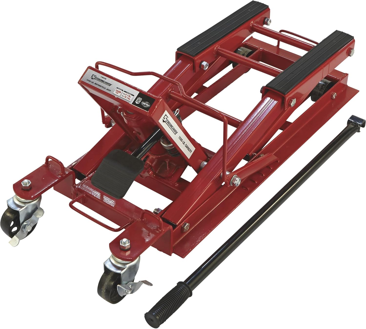 This low-profile Strongway 1500-Lb. Hydraulic Motorcycle Lift/Utility Vehicle Lift is ideal for stabilizing your motorcycle, ATV or UTV while you detail or make repairs. The convenient foot pump raises the load from 5 1/8in. to 16 1/8in. with 5 lockable lift heights. The jack doubles as a support stand. Meets and complies with ASME PASE 2019 safety standards.
