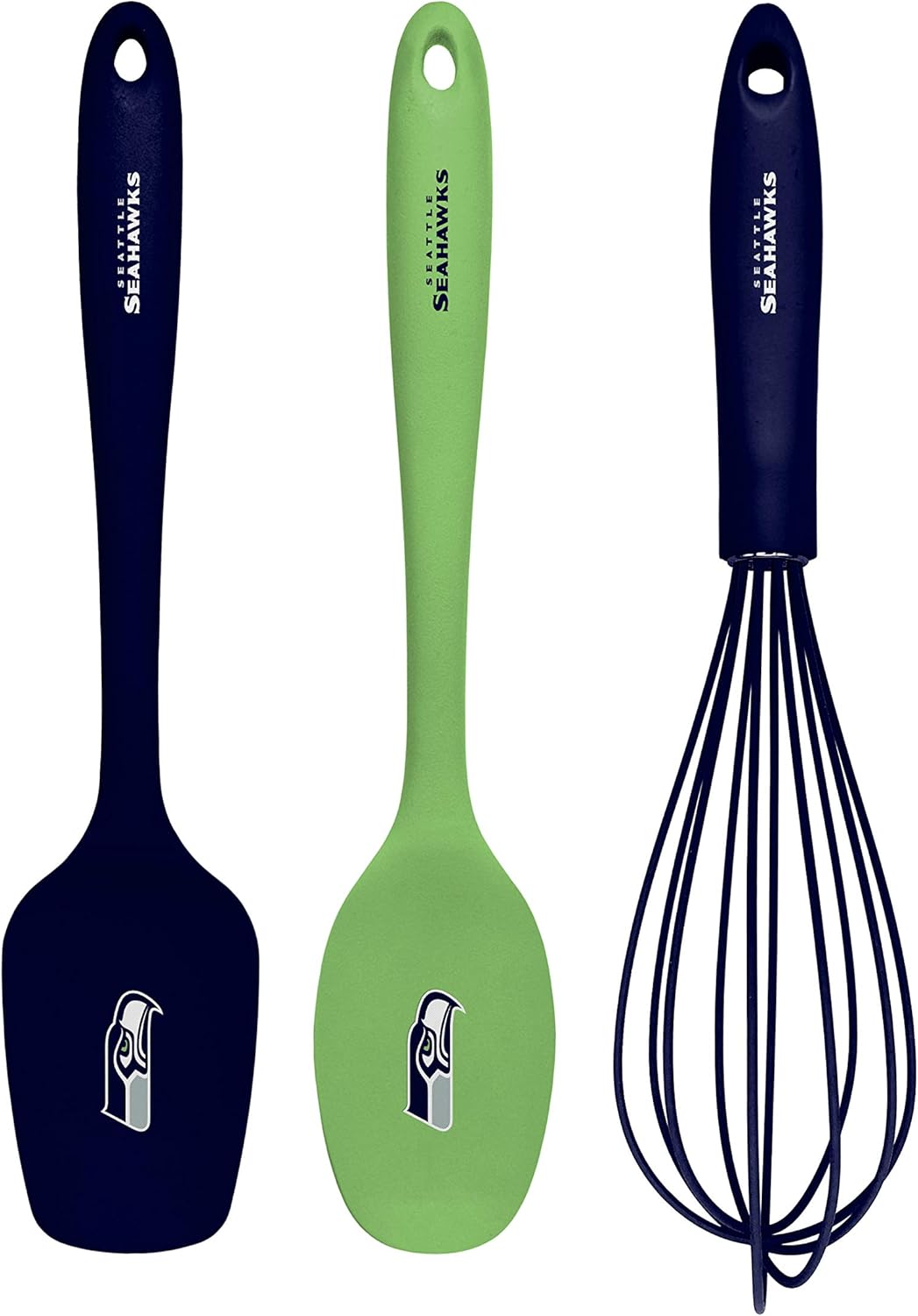 Look no further... this 3-Piece Kitchen Utensil Set by The Sports Vault is the perfect addition to your kitchen. It includes a silicone spatula, silicone serving spoon and silicone whisk, and can be used for multiple daily kitchen tasks including sauteing vegetables, whisking pancake batter and making the fluffiest scrambled eggs. Made with premium food grade silicone that is safe and BPA free, built to withstand high heat and will not scratch your cookware. Extremely easy to clean and dishwasher safe. Showcase your team loyalty for your favorite team with the printed team logo on the spatula and serving spoon and team wordmark on the handles for each utensil.