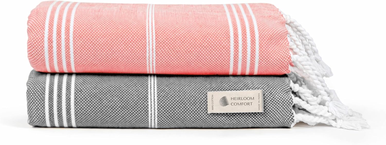 Experience everyday luxury with our HEIRLOOM COMFORT Turkish Beach Towels designed to bring vibrant style and premium functionality to your beach, poolside, gym, or travel adventures. Made from 100% cotton, our oversized towels (40"x71") offer the perfect combination of softness, absorbency, and quick-drying performance - ideal for all your beach or on-the-go moments. Each towel is pre-washed to prevent shrinkage, ensuring a consistently perfect fit and feel from the very first use. The lightweight and compact design makes them easy to fold, carry, and store in your beach bag, suitcase, or backpack - perfect for camping, travel, yoga, or gym workouts. Whether you're heading to the beach, spa, pool, cruise, or lake, these fast-drying and sand-free towels offer unmatched convenience and comfort. Our towels feature multi-color designs that stand out in any setting - choose from the best pair colors. The eye-catching patterns are perfect for expressing your personal style while being highly functional. They are also machine washable and fade-resistant, making them reusable alternative to bulky traditional bath towels. Crafted for both male and female, our towels are ideal for family vacations, beach parties, summer camps, swimming lessons, and outdoor fitness routines. Their absorbent and breathable weave allows for quick absorption, keeping you dry and comfortable.
