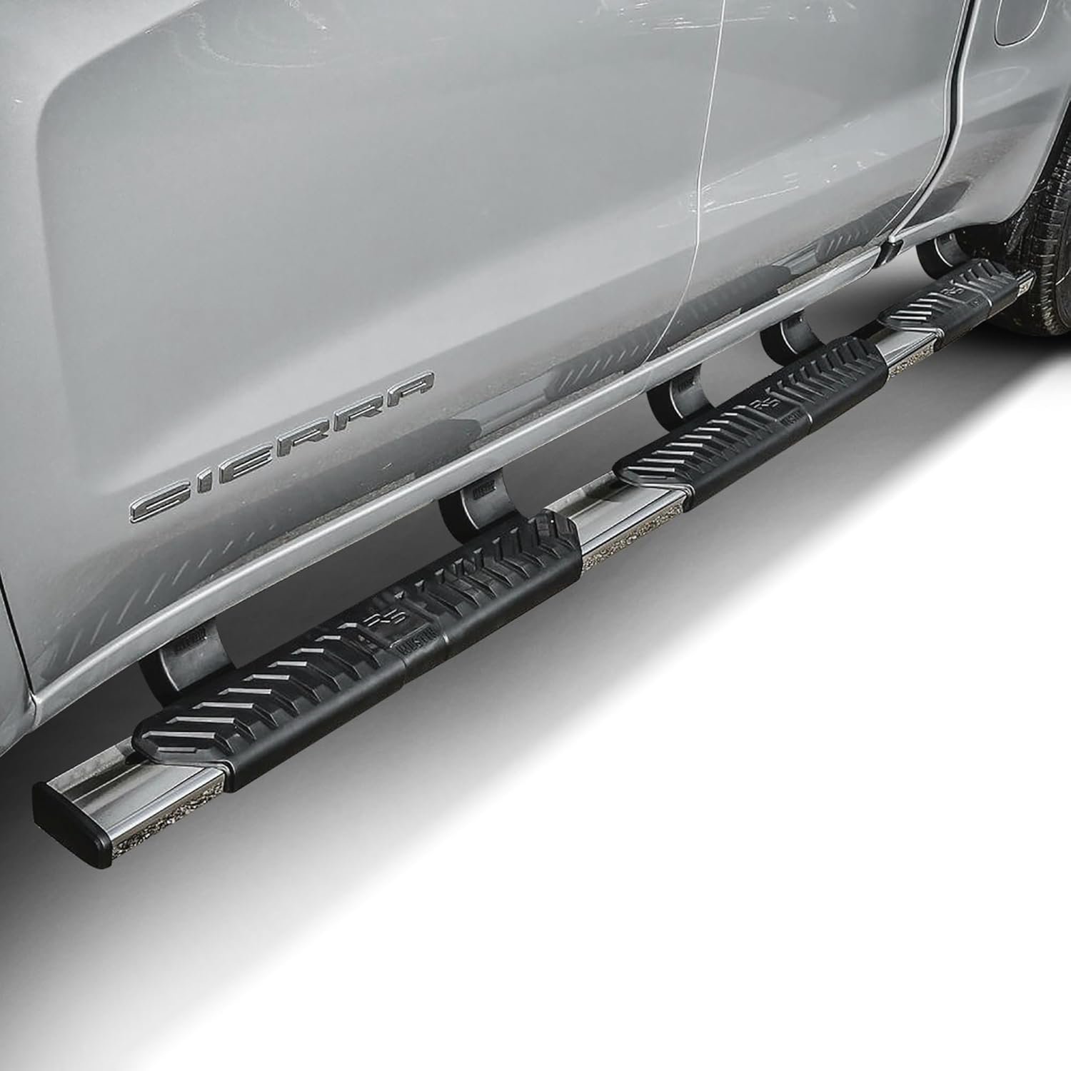 Get a boost, with Westins R5 M-Series Wheel-To-Wheel Nerf Step Bars. The extra wide 5in. footprint step design provides easier and safer vehicle access for both drivers and passengers. Developed and engineered in the USA, the R5 M-Series Wheel-to-Wheel Nerf Step Bars feature three oversized skid resistant step pads allowing easy access to the vehicle cab or truck bed cargo area. Built with high-grade and corrosion resistant steel designed to mount directly to your vehicles existing rocker panels. The modular design saves you money on shipping, as no truck freight costs are required. Also included are injection molded bracket covers for a clean and stylish look. Westins exclusive Isolator Bracket supports the step bar past the truck cab, a feature that competitors do not offer. Without an Isolator Bracket, the step area that extends past the vehicle is left unsupported. Westins unique design provides added bar support without resulting in annoying creaking sounds.